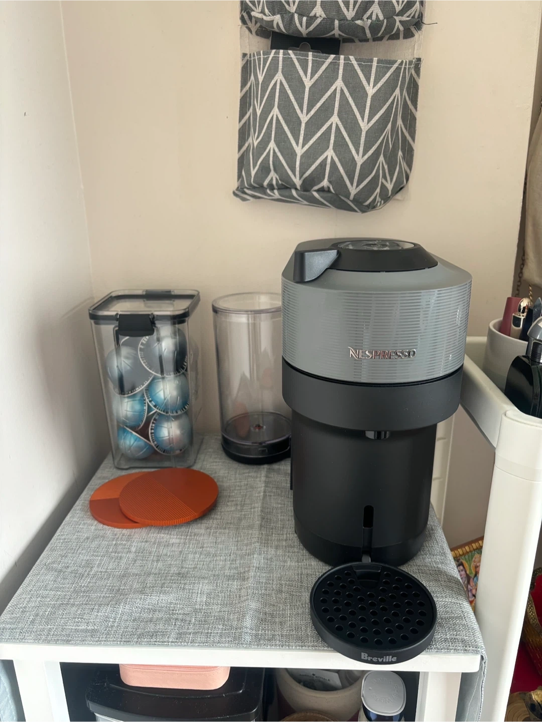 This Nespresso VertuoPlus machine makes delicious coffee. It's a sleek grey and black model from Breville.