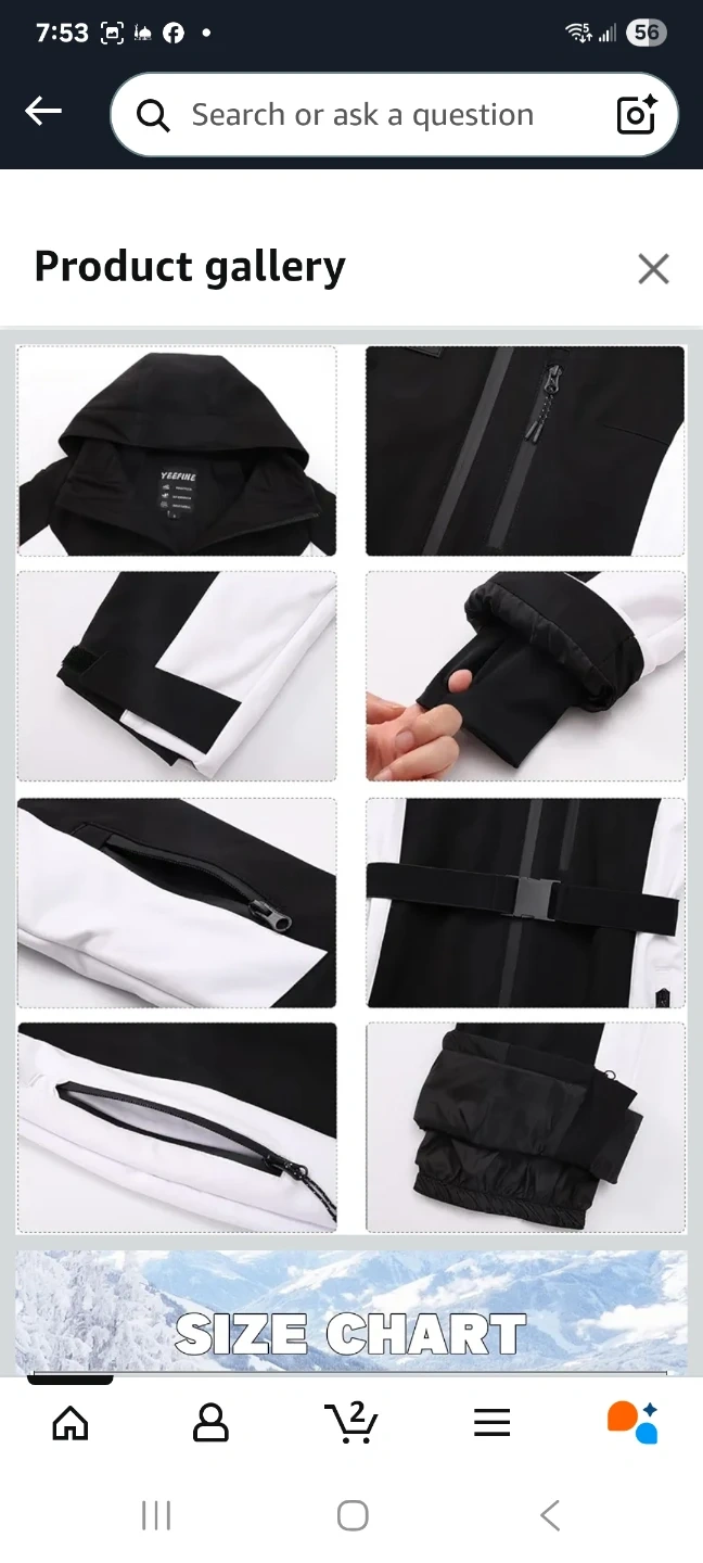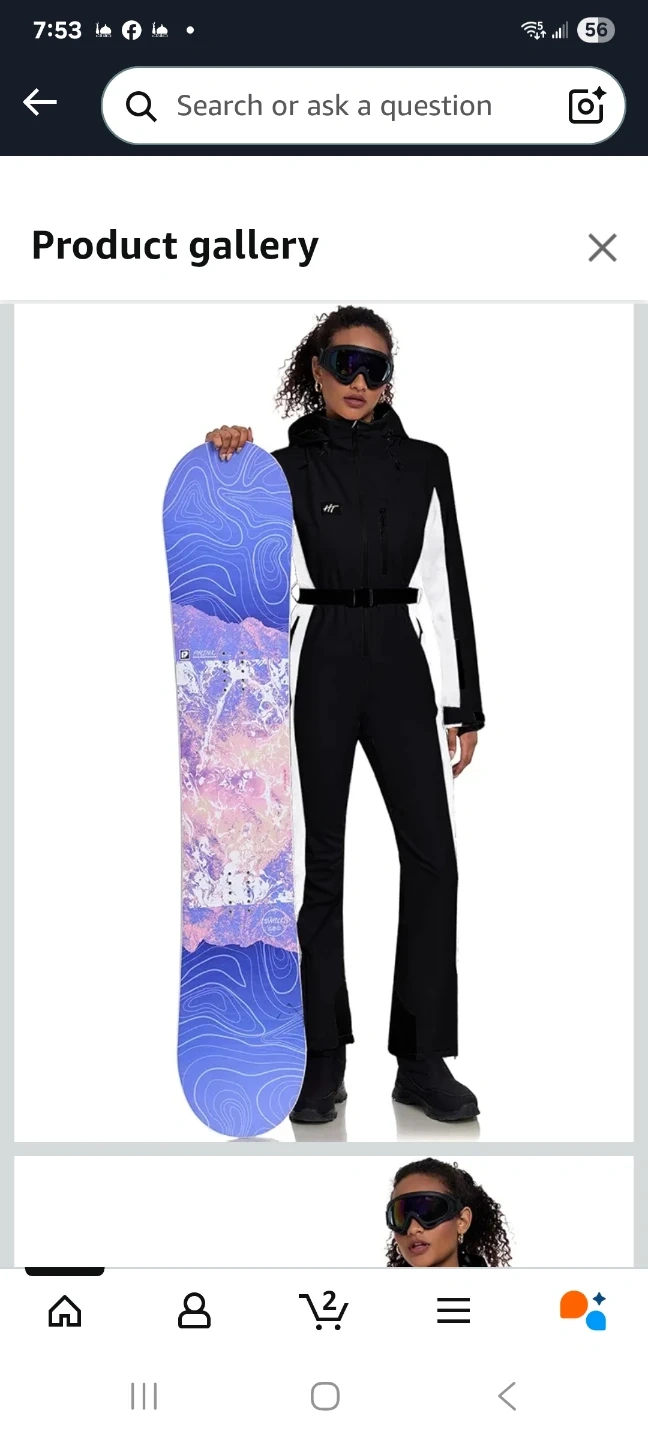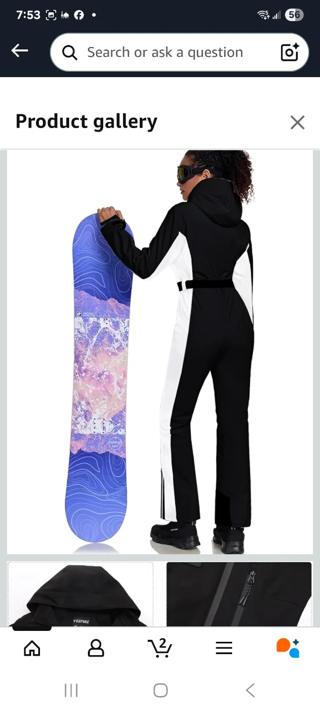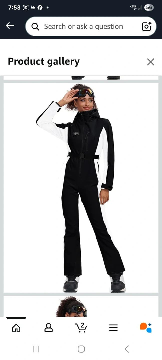 This women's ski suit is designed for winter sports, featuring a black and white colour block design. It's a one-piece jumpsuit perfect for snowboarding or skiing. Includes a hood and adjustable belt.
