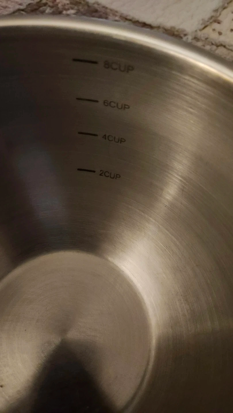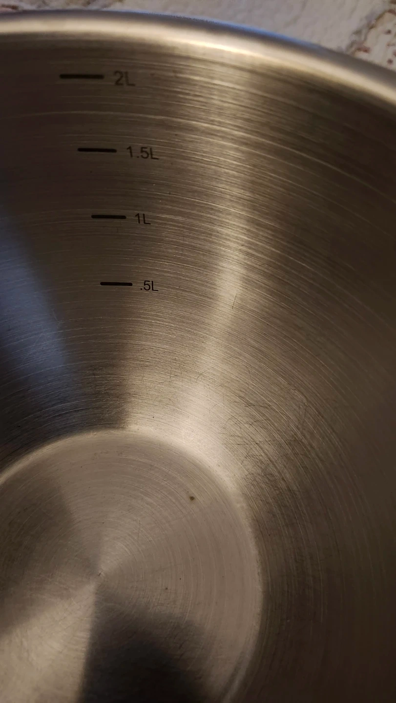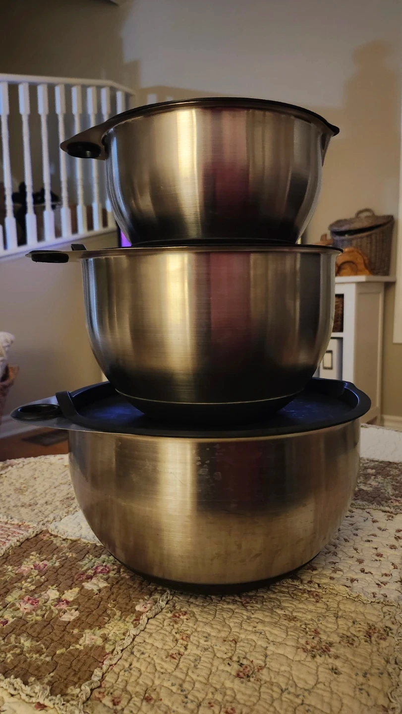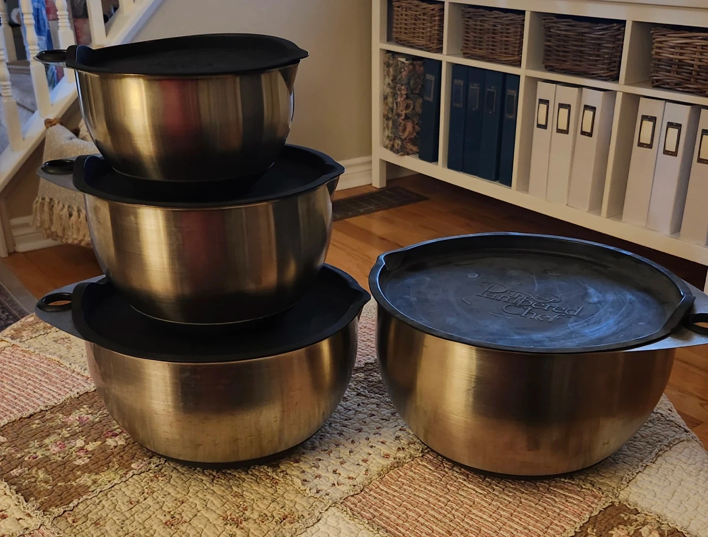 Four stainless steel mixing bowls from The Pampered Chef, each with a fitted lid. The bowls have cup and litre measurements inside. (Lid on the XL bowl is discolored, not sure why)