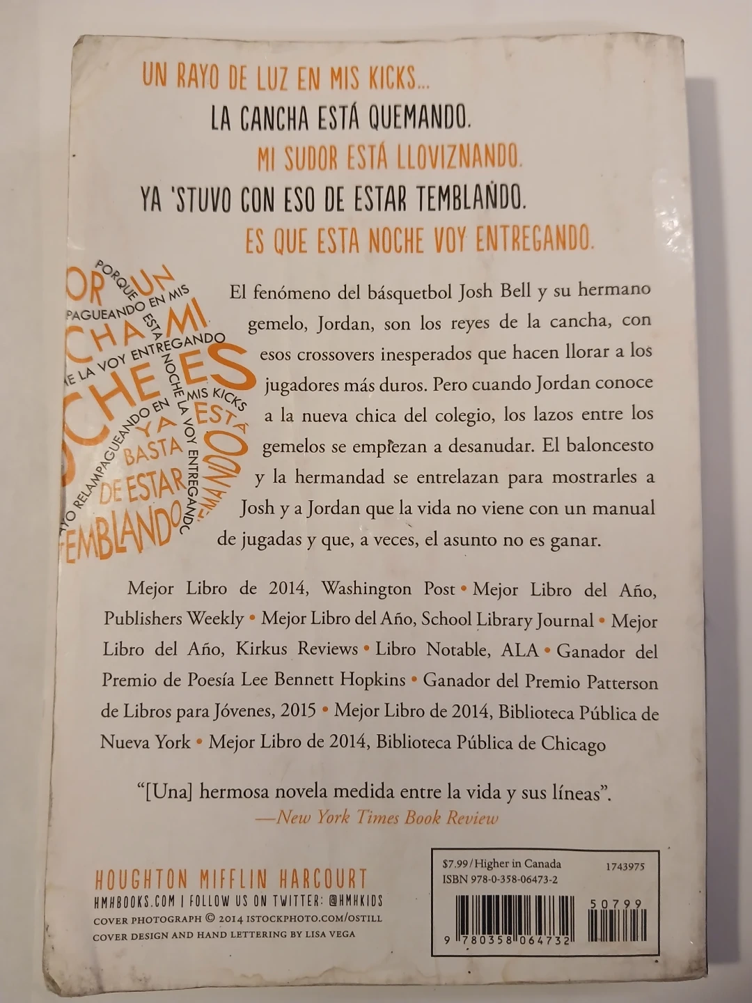 This is 'The Crossover' paperback book by Kwame Alexander. It's a New York Times Bestseller and winner of multiple awards. It tells the story of twins Josh and Jordan Bell.