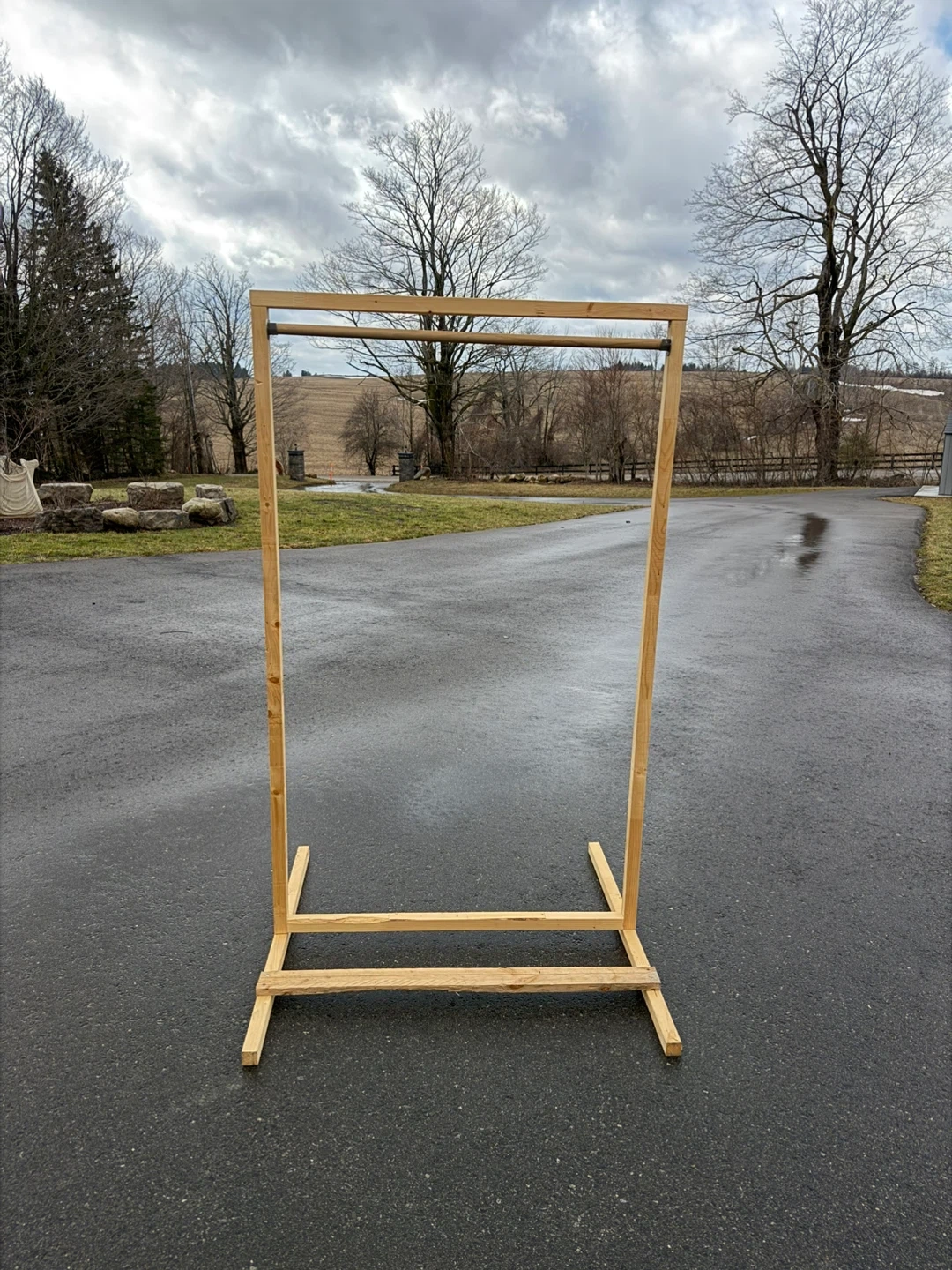 This wooden rack has a simple, sturdy design. It's made of natural wood with metal accents holding the top bar. It's a freestanding unit, useful for hanging clothes or displaying items (ex. welcome signs for events).