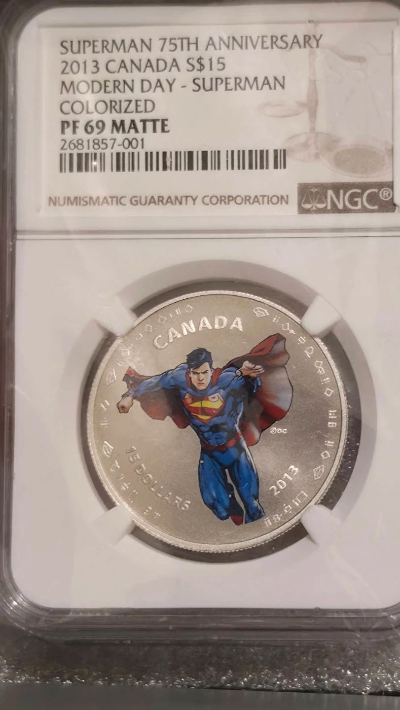 NGC graded PF 69 Matte coin commemorating Superman's 75th Anniversary. This Canadian $15 coin features a colorized image of Superman in flight. A unique collectible for any Superman fan!