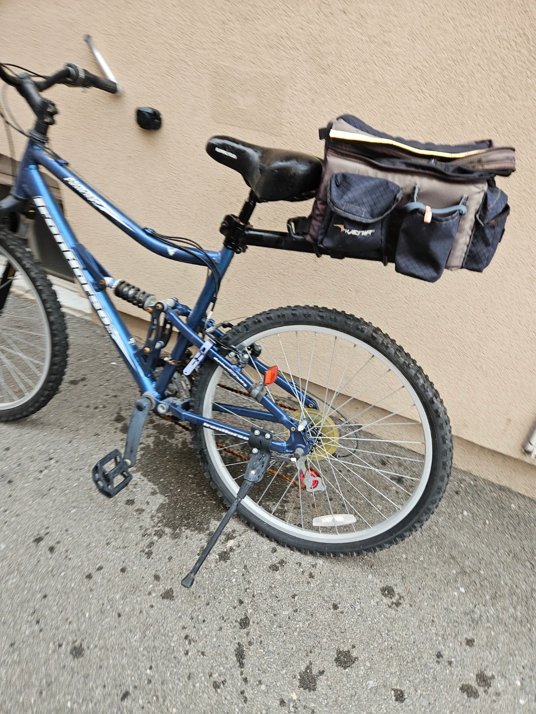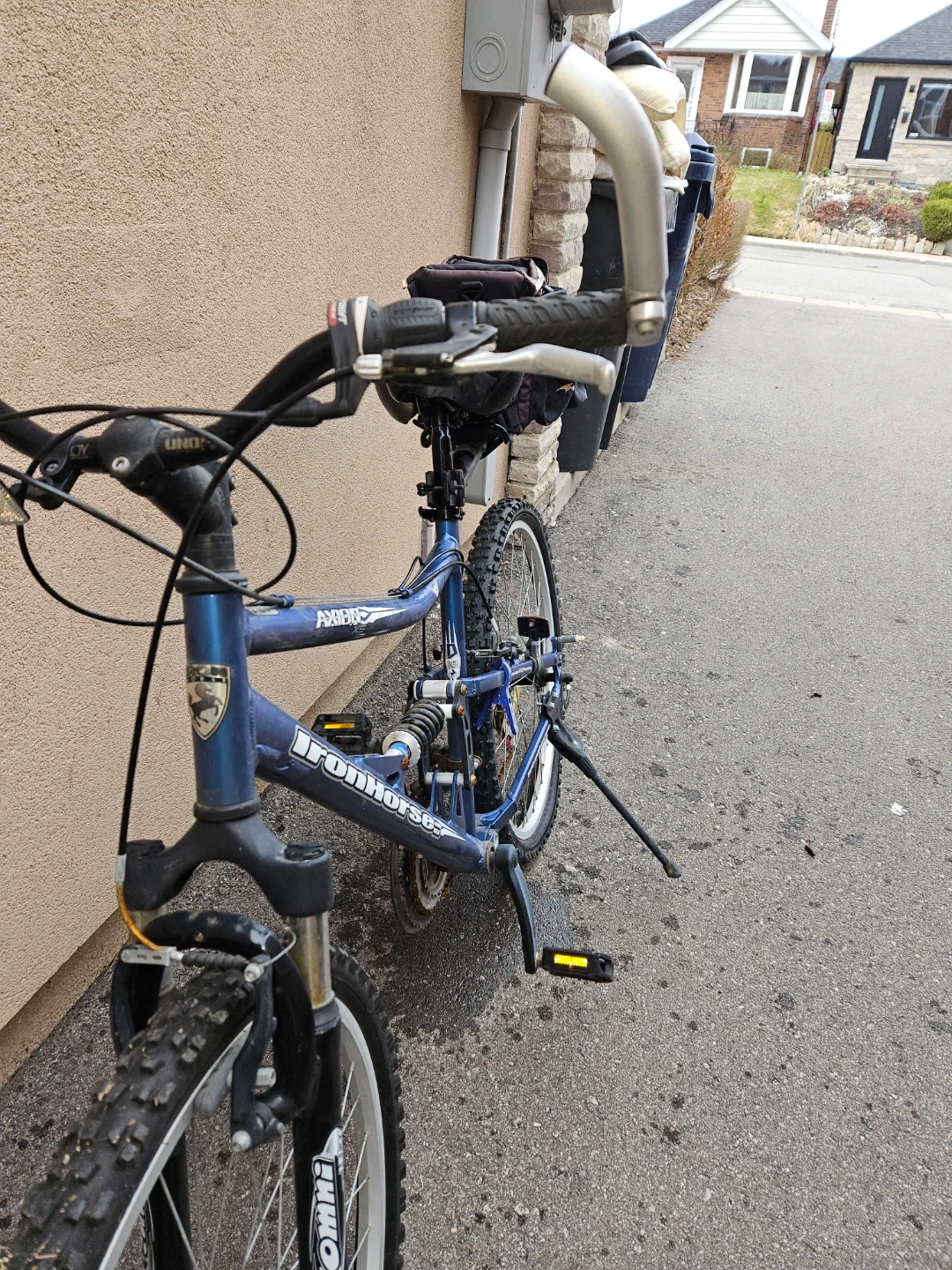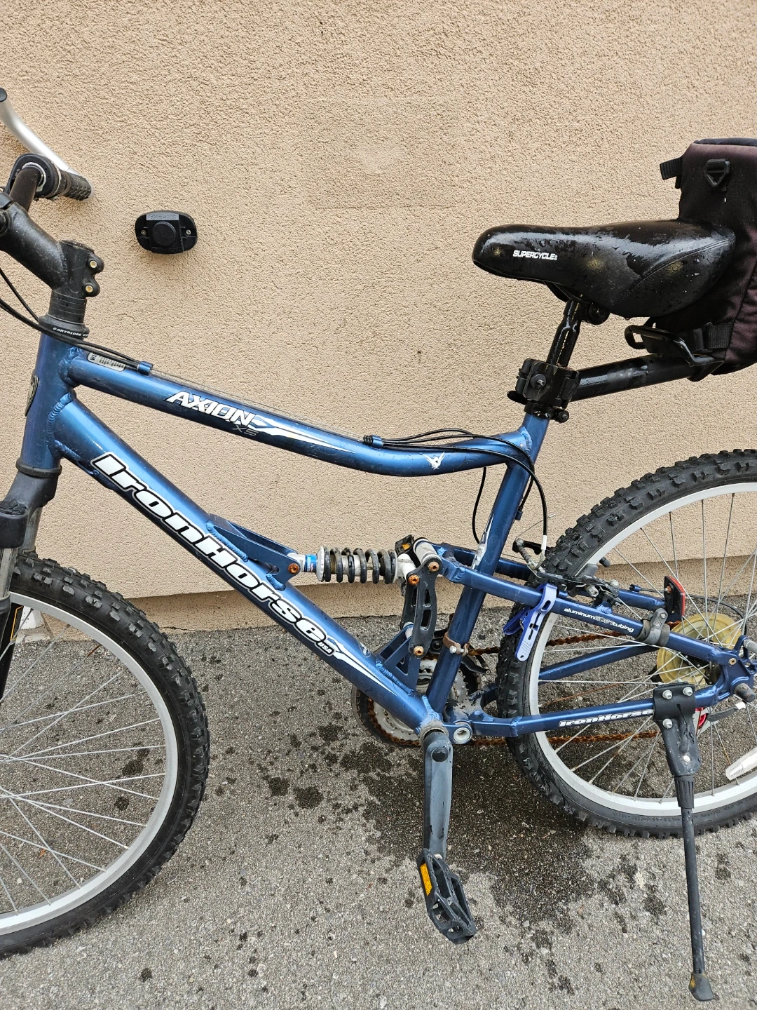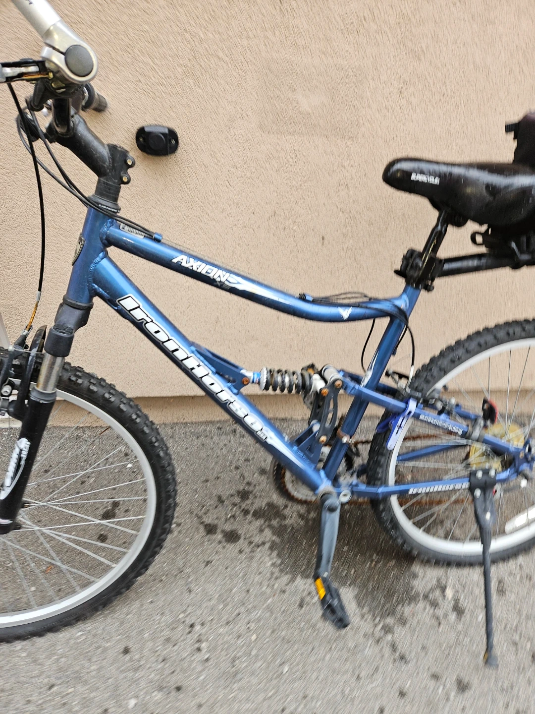 This is a blue Iron Horse Axion full suspension mountain bike. It comes with a rear saddle bag. Great for tackling trails!