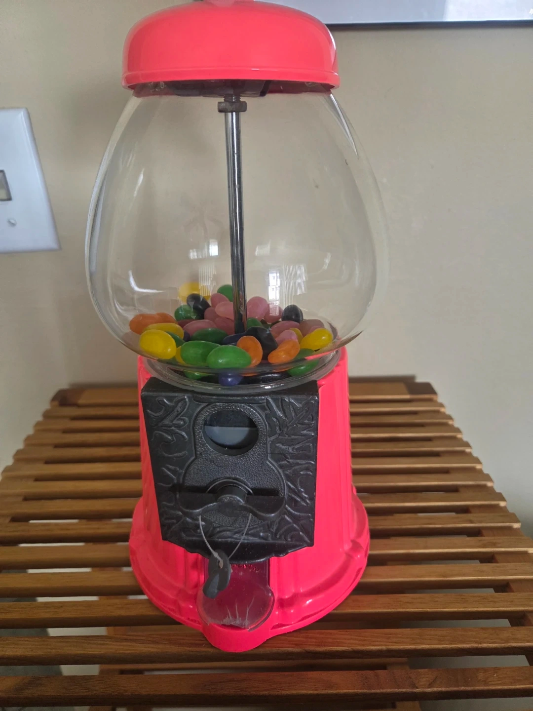 This is a bright pink gumball machine with a clear globe. It has a black dispensing mechanism. Comes with colourful jelly beans inside (they've been in there about 1 month)! Perfect for a fun treat dispenser.