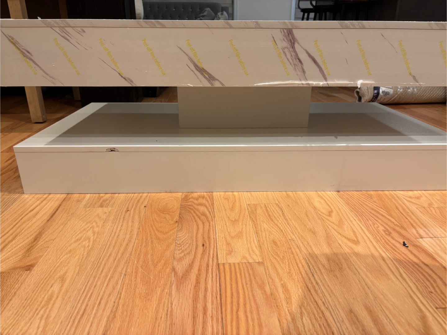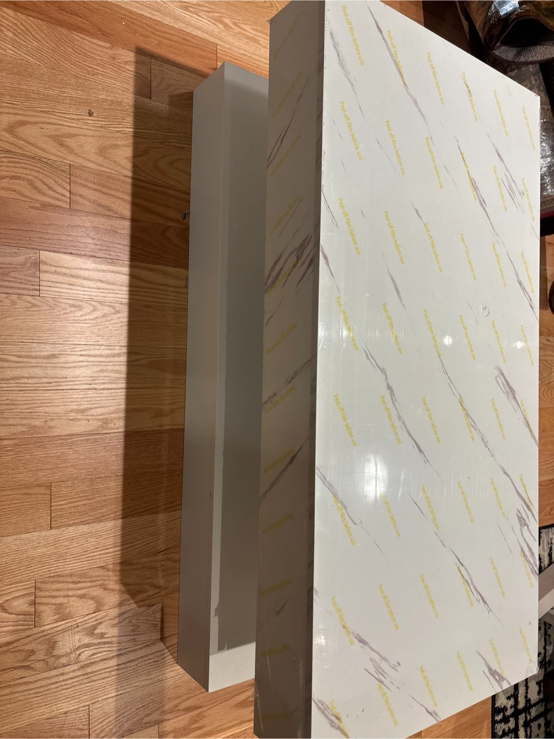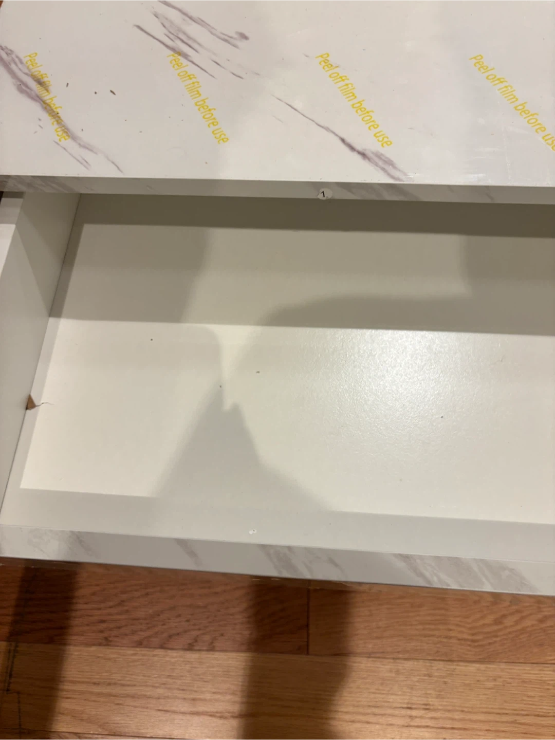 This coffee table has a white marble-look top with a protective film that needs to be peeled off before use. It features a single drawer for storage. Great for a living room! It is brand new and has a little damage during assembling. It was bought from an auction site. Available for pickup and delivery.