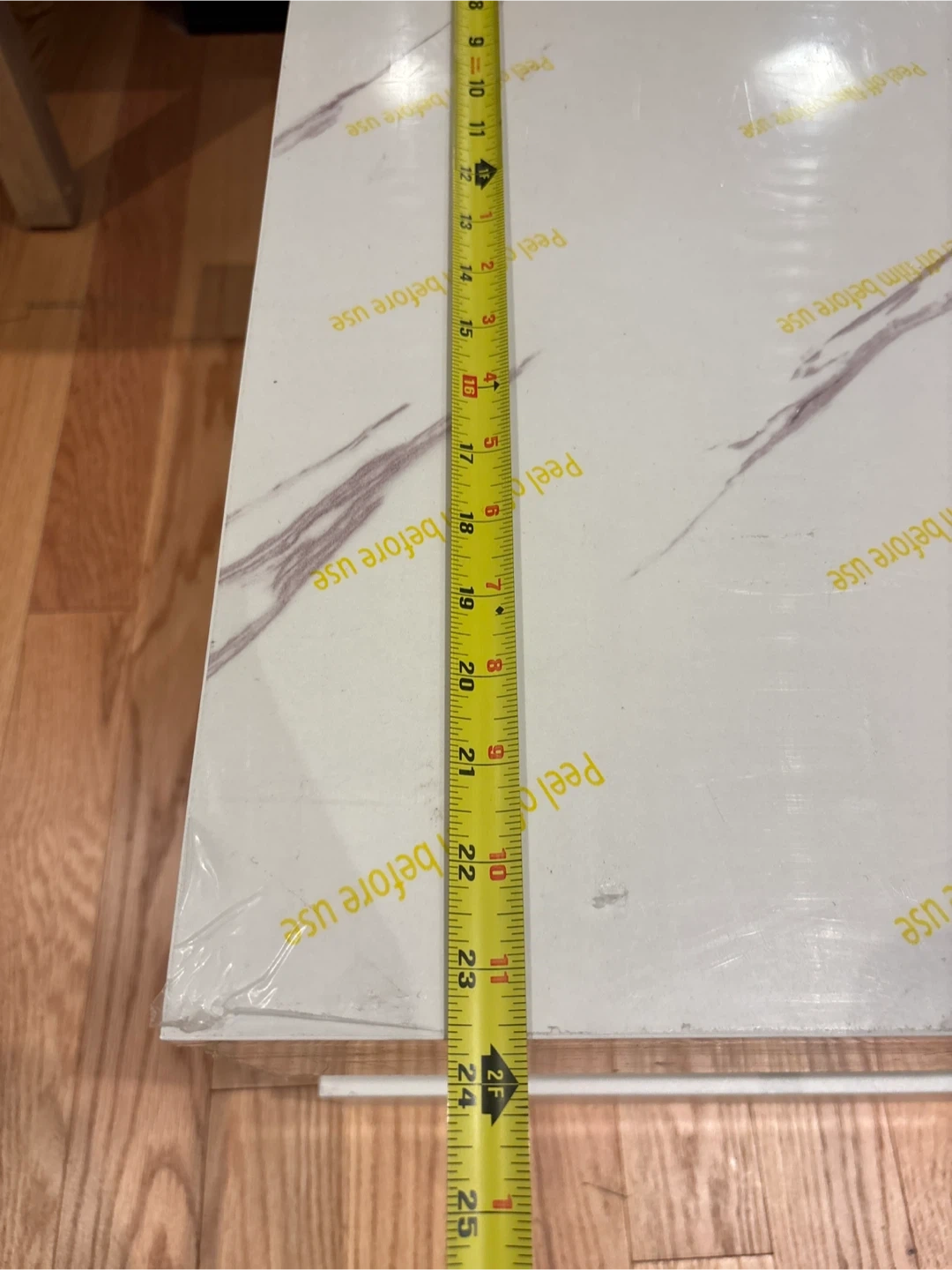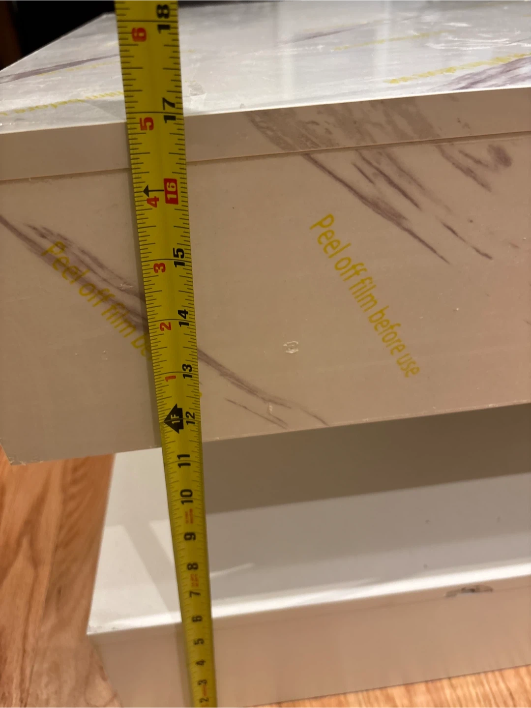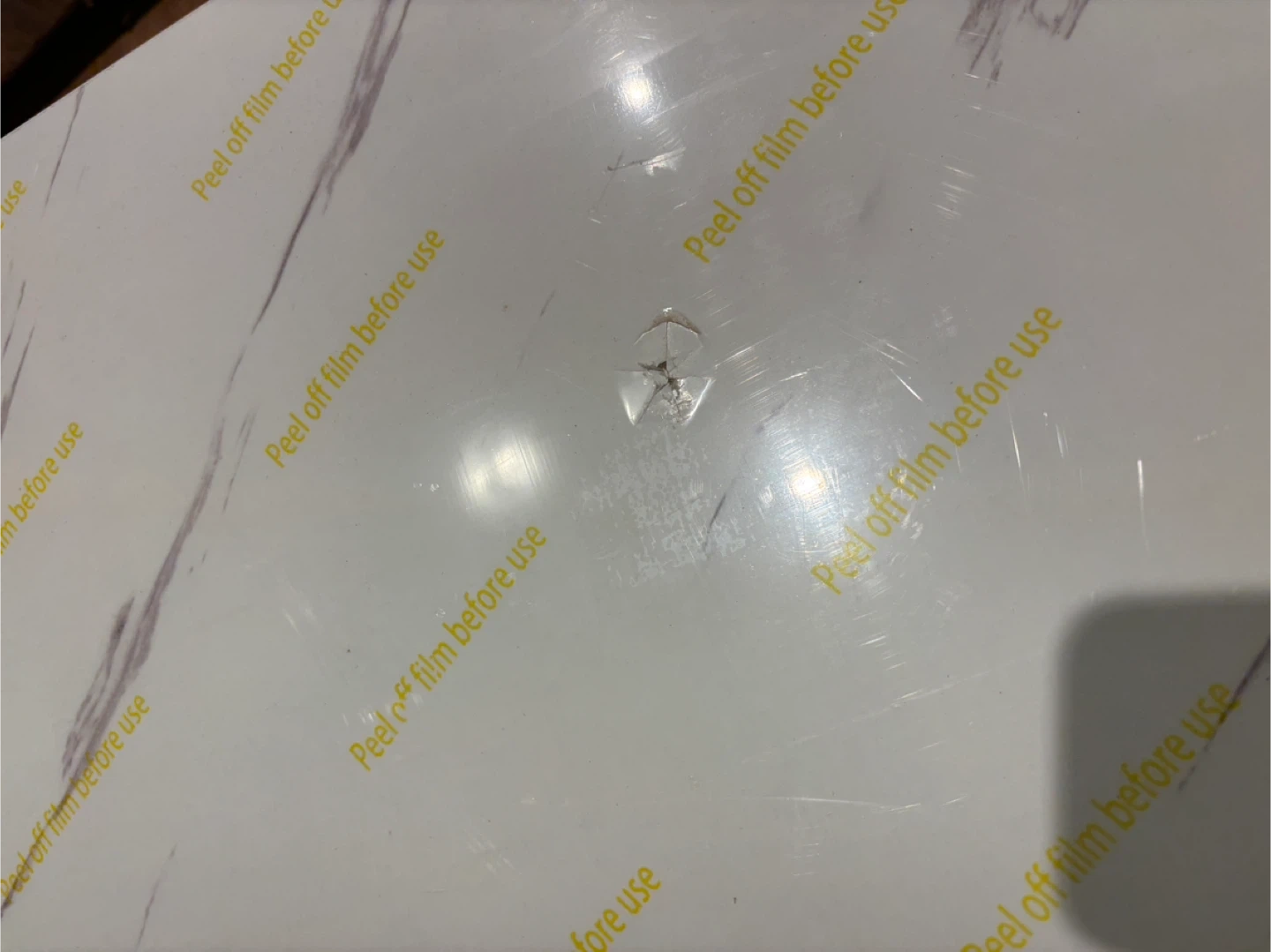 This coffee table has a white marble-look top with a protective film that needs to be peeled off before use. It features a single drawer for storage. Great for a living room! It is brand new and has a little damage during assembling. It was bought from an auction site. Available for pickup and delivery.