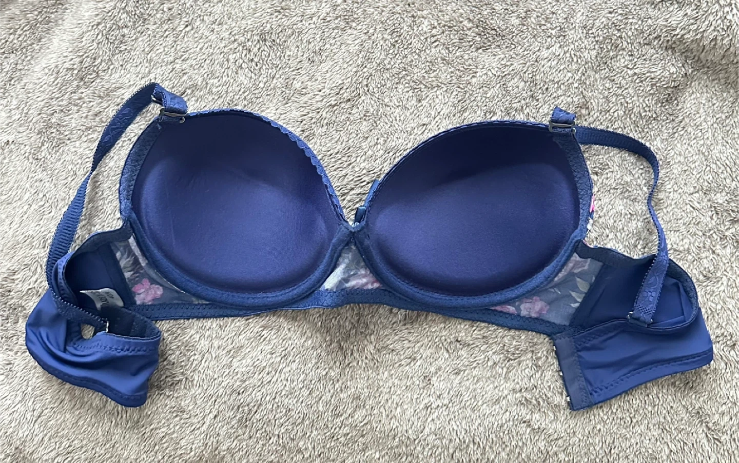 A lovely blue bra featuring a delicate floral print and lace trim.