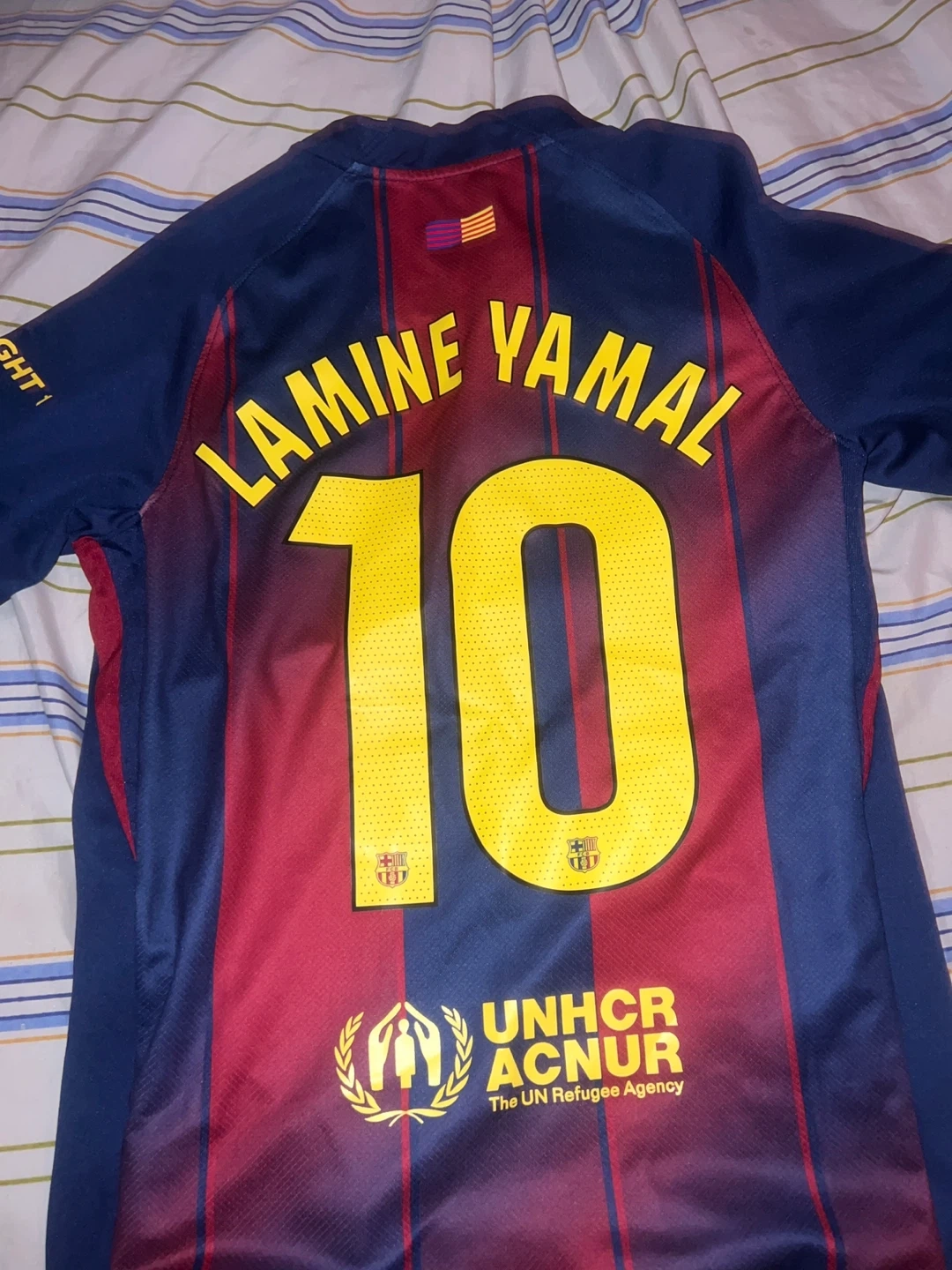 This is an FC Barcelona jersey with Lamine Yamal's name and number 10 on the back. It features the Spotify sponsor logo on the front. The shirt is made of polyester.
