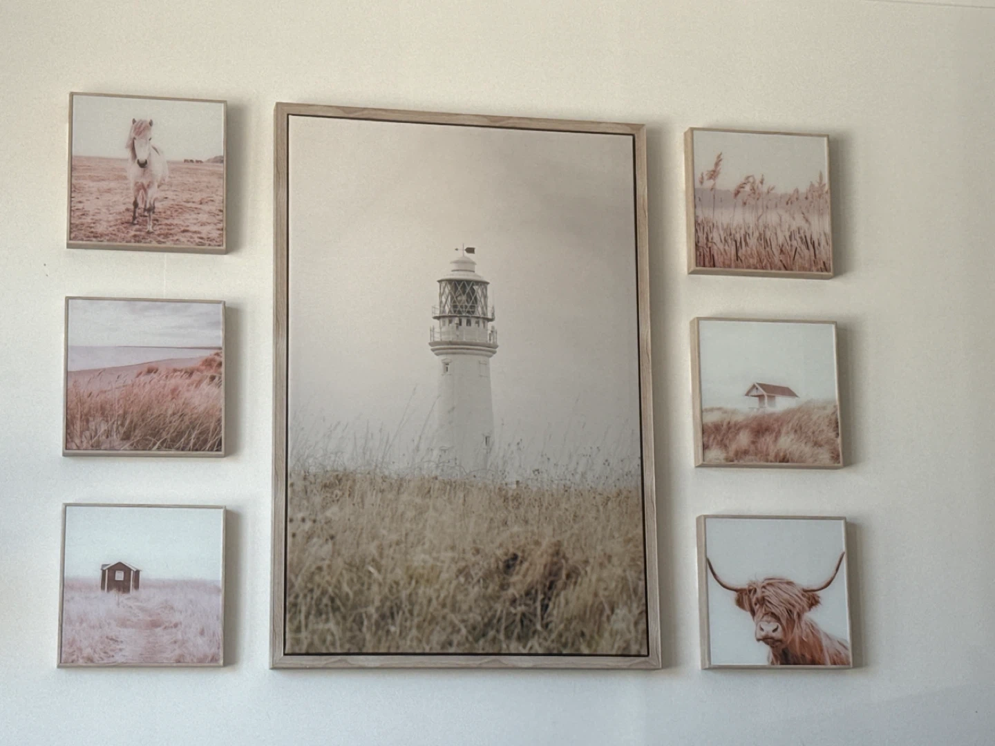 This set includes seven framed prints featuring coastal landscapes, a lighthouse, a Highland cow, and a horse. They're finished with light wood-look frames. Perfect for adding a touch of rustic charm to your home decor!