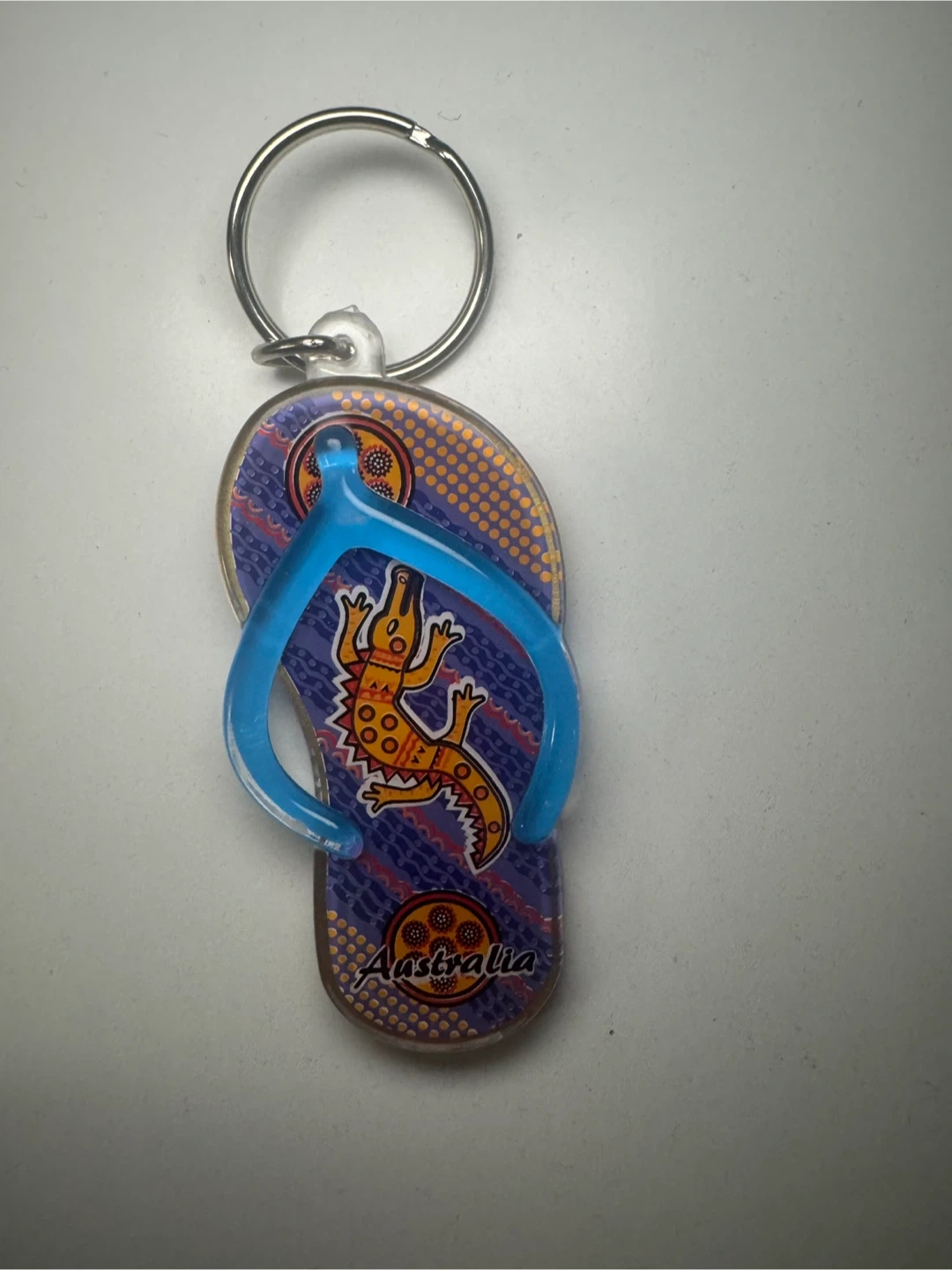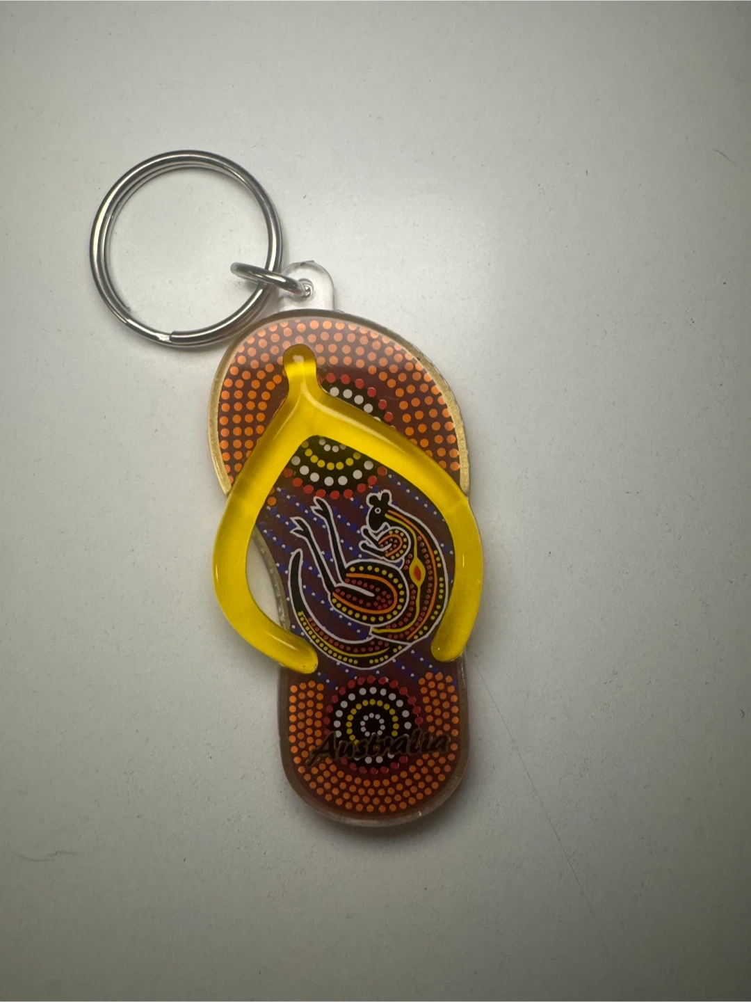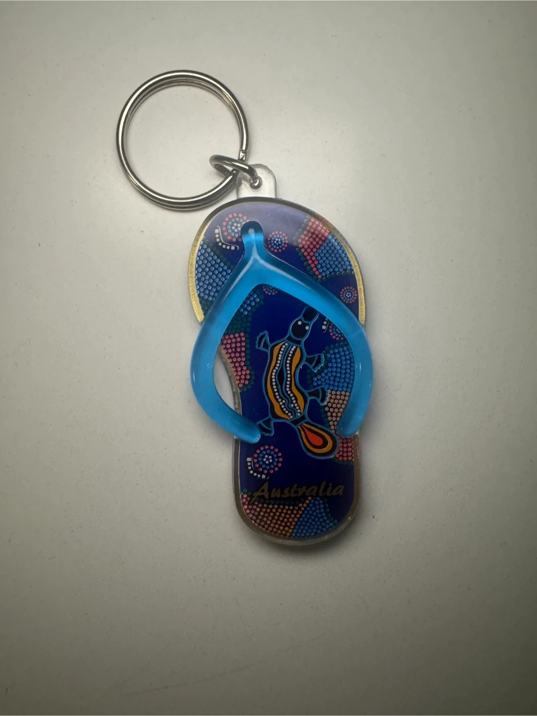 Cute souvenir keychains featuring aboriginal art designs and Australian animals. Each keychain is shaped like a mini flip-flop or Aussie ‘thong.’ Attached to a silver keyring for easy attachment to keys or bags. Perfect for travellers, beach lovers or as a memento!
