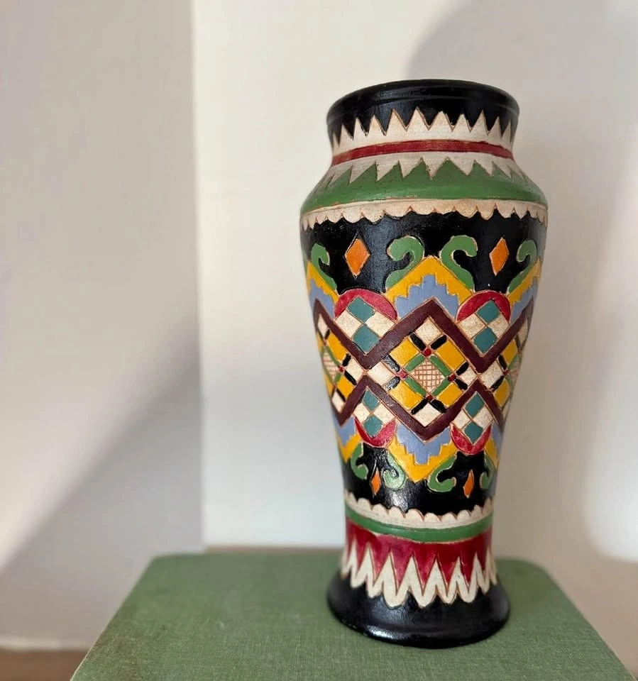 Vintage hand-painted terracotta vase featuring bold geometric Southwest / Mexican-inspired patterns in rich black, red, green, yellow, and blue tones. Matte painted finish with raw clay interior and base, typical of mid-century decorative pottery.