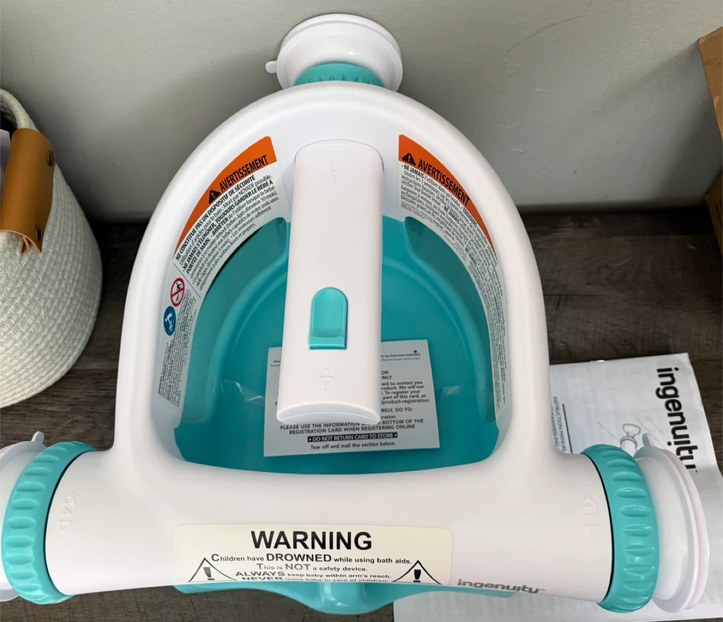 brand new. This bath seat supports child transitioning to an adult tub. It's white and teal with adjustable arms. Easy to clean and store.