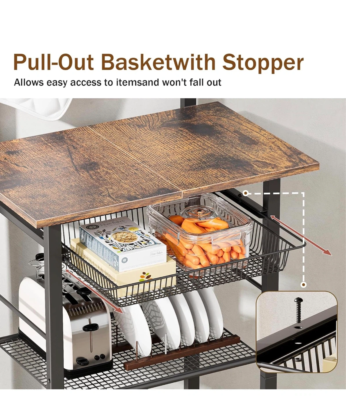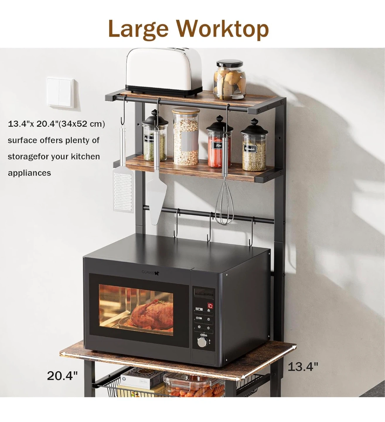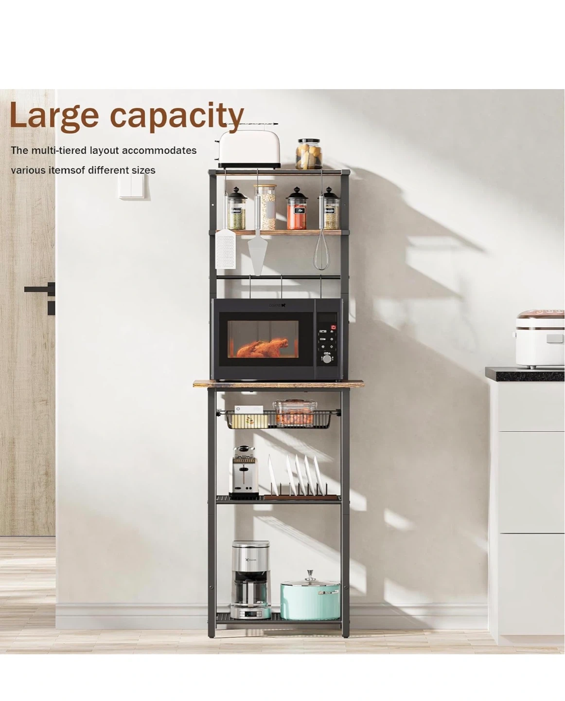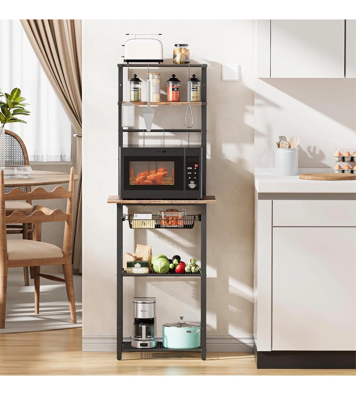 This 6-tier kitchen bakers rack offers ample storage for your appliances and kitchen essentials. It features a rustic brown finish and a sturdy metal frame. The dimensions are 52" x 35.5" x 142CM.