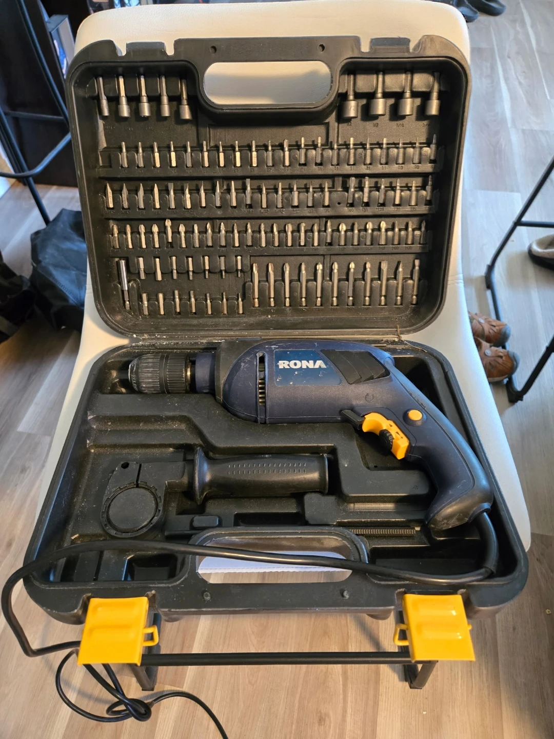 This RONA corded drill comes with a large assortment of bits in a convenient carrying case. It's a handy set for various home projects. The drill has a blue and yellow design.
