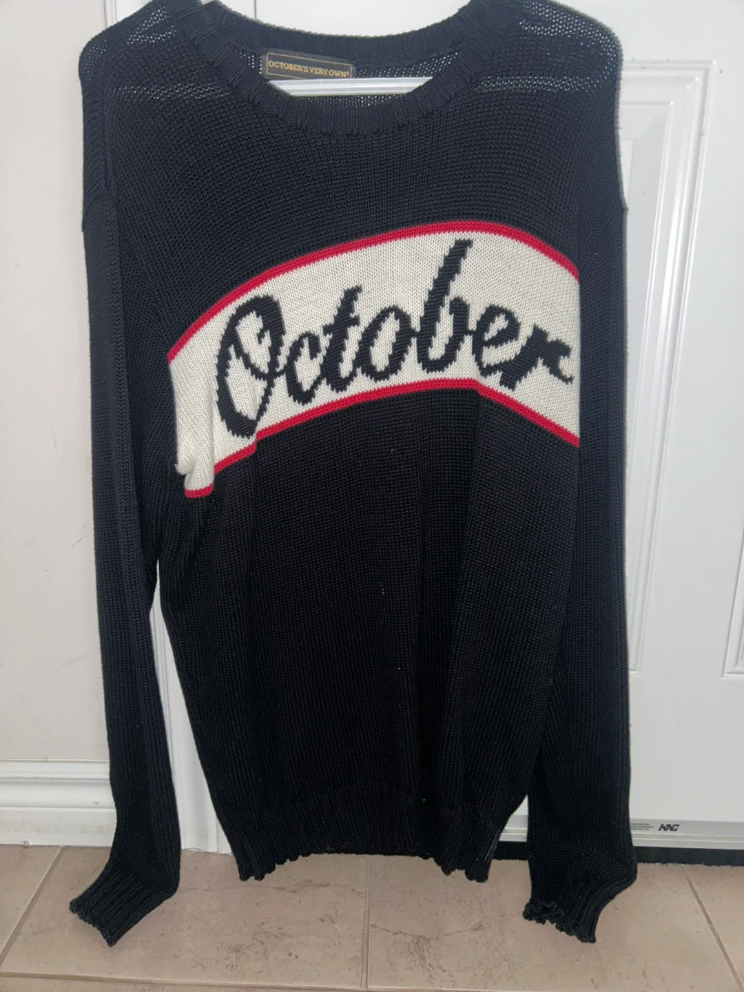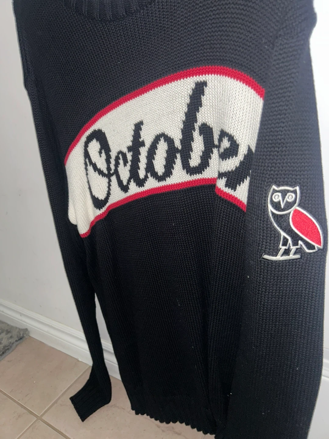 Black knit sweater from October's Very Own. Features the signature 'October' graphic across the chest and an owl logo on the sleeve. It's made of a soft, comfortable knit material. This sweater is great for layering or wearing on its own during cooler weather.