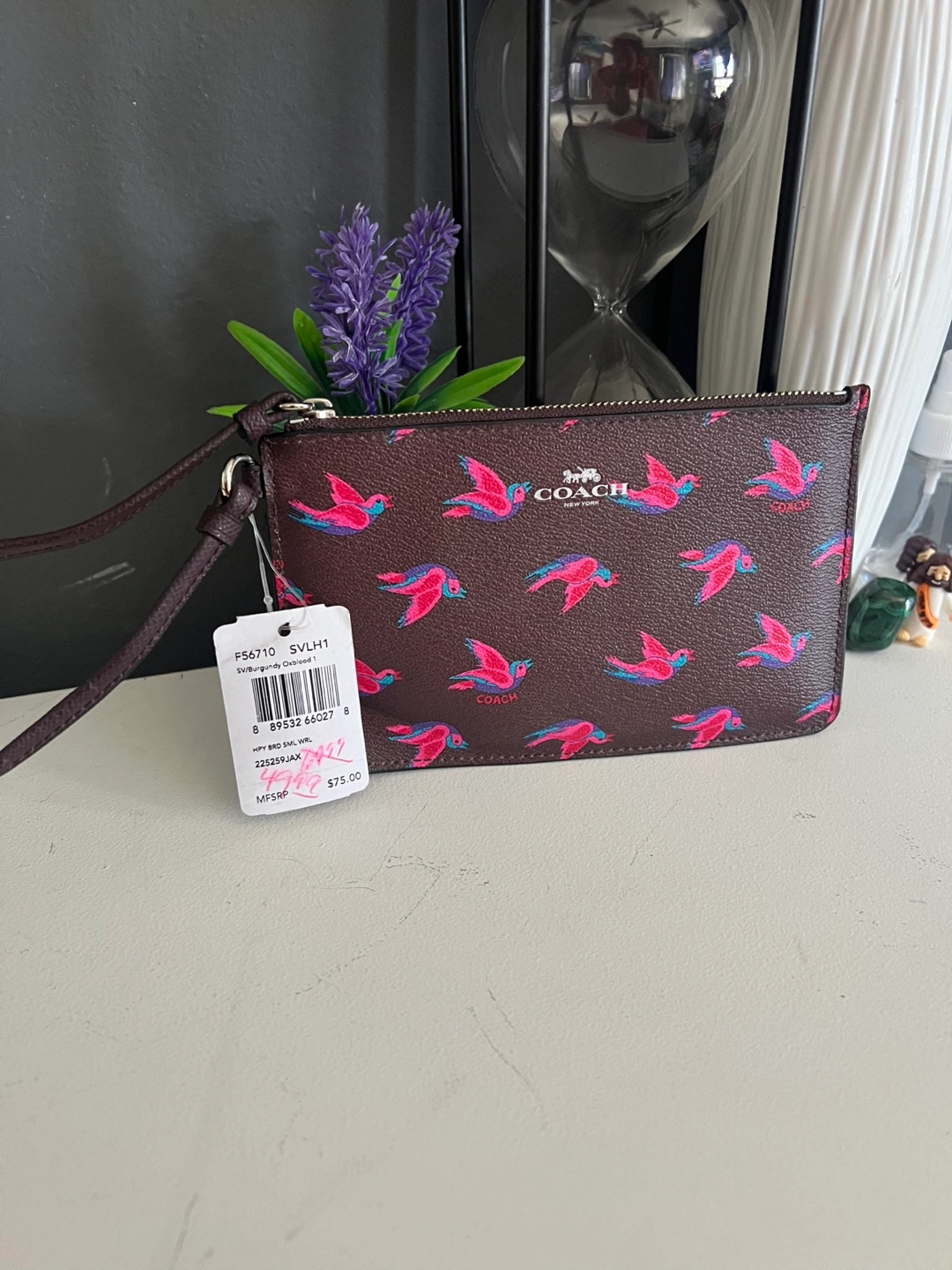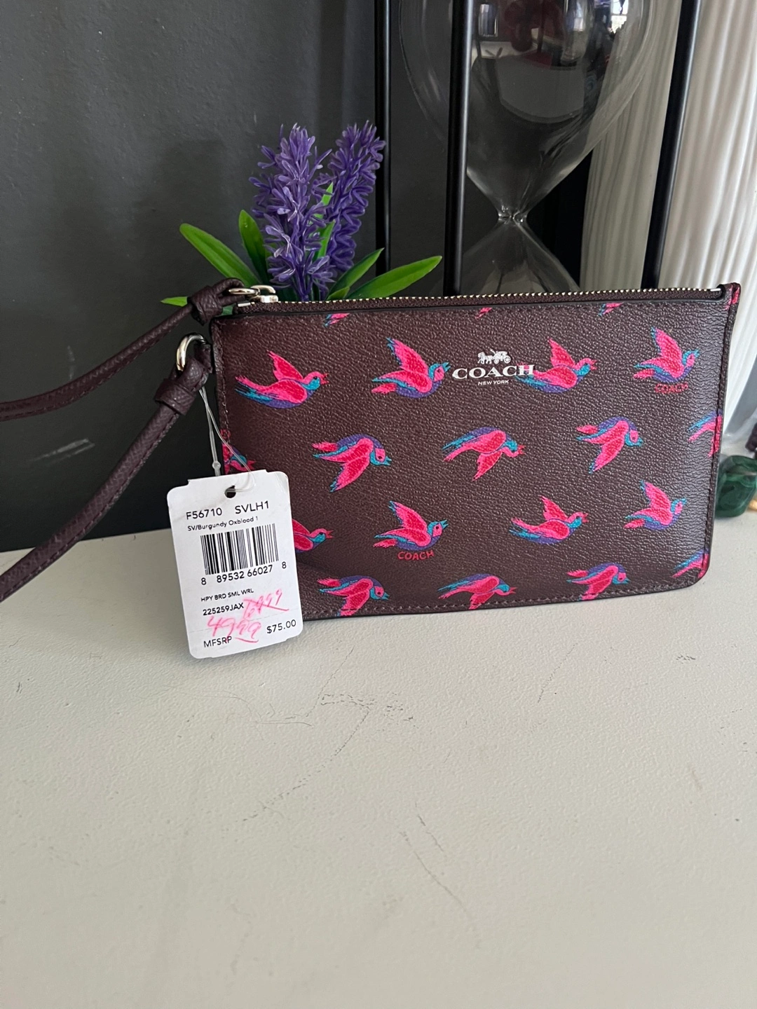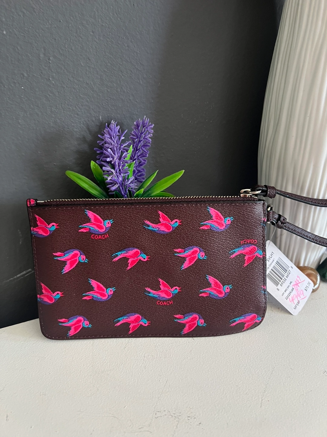 This Coach wristlet features a fun brown background with a repeating bird print. It's perfect for carrying essentials on the go. The bag includes a detachable wrist strap.