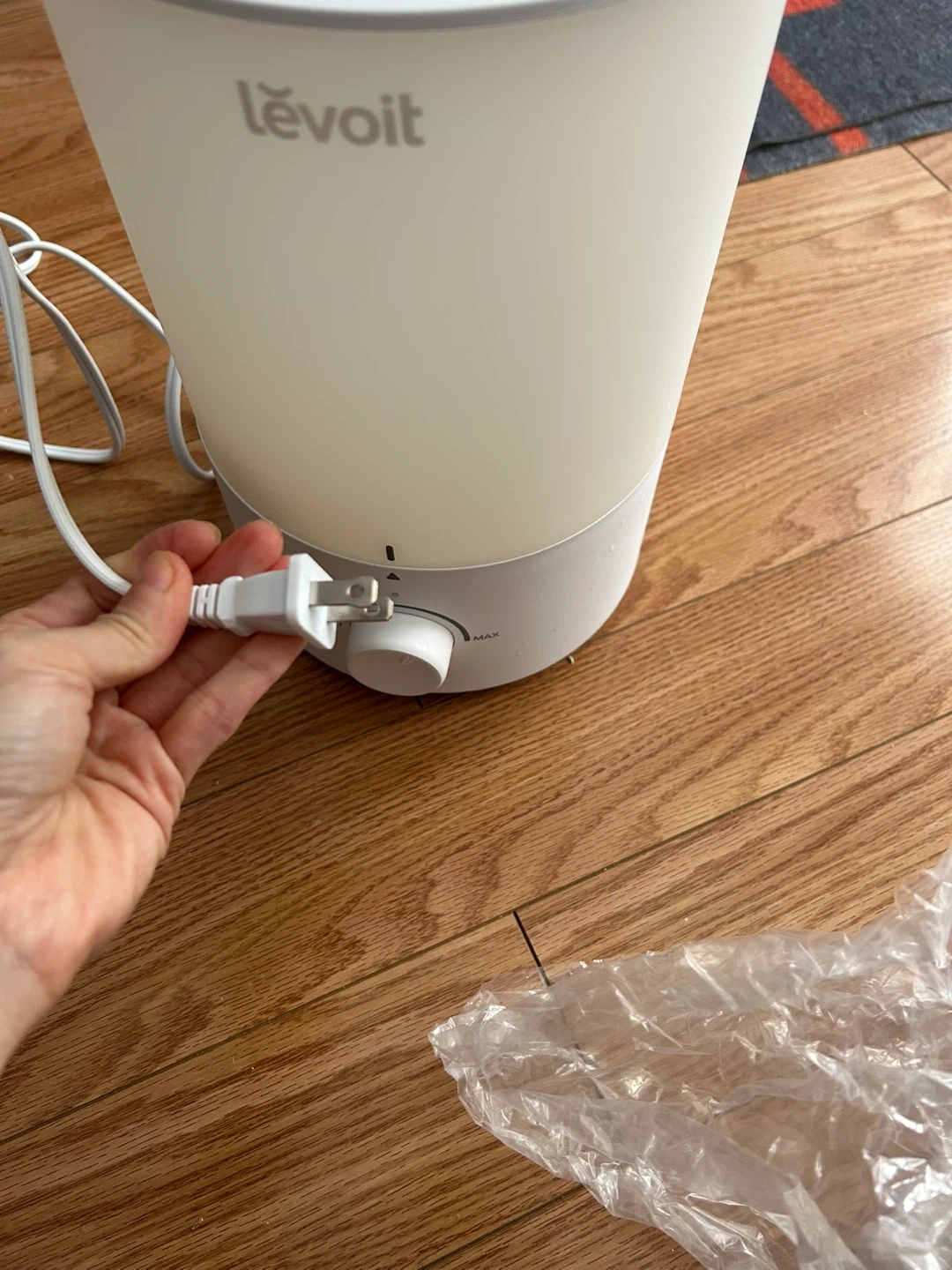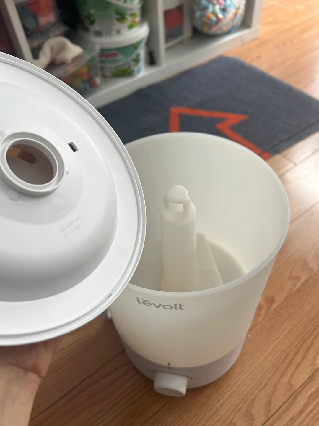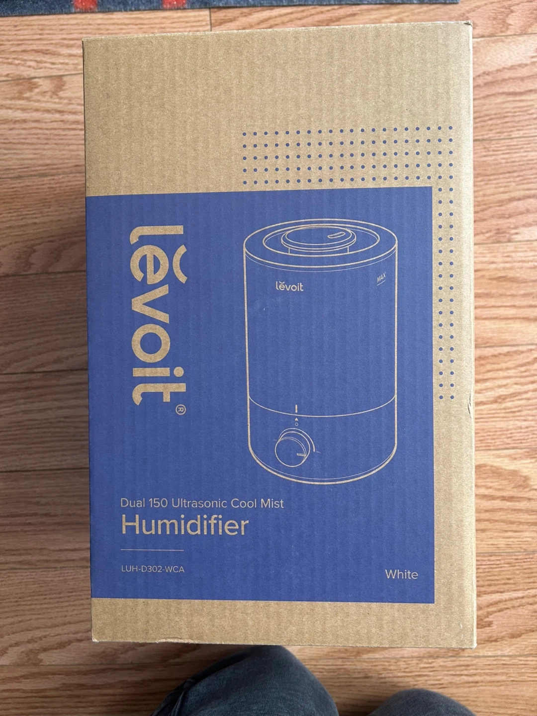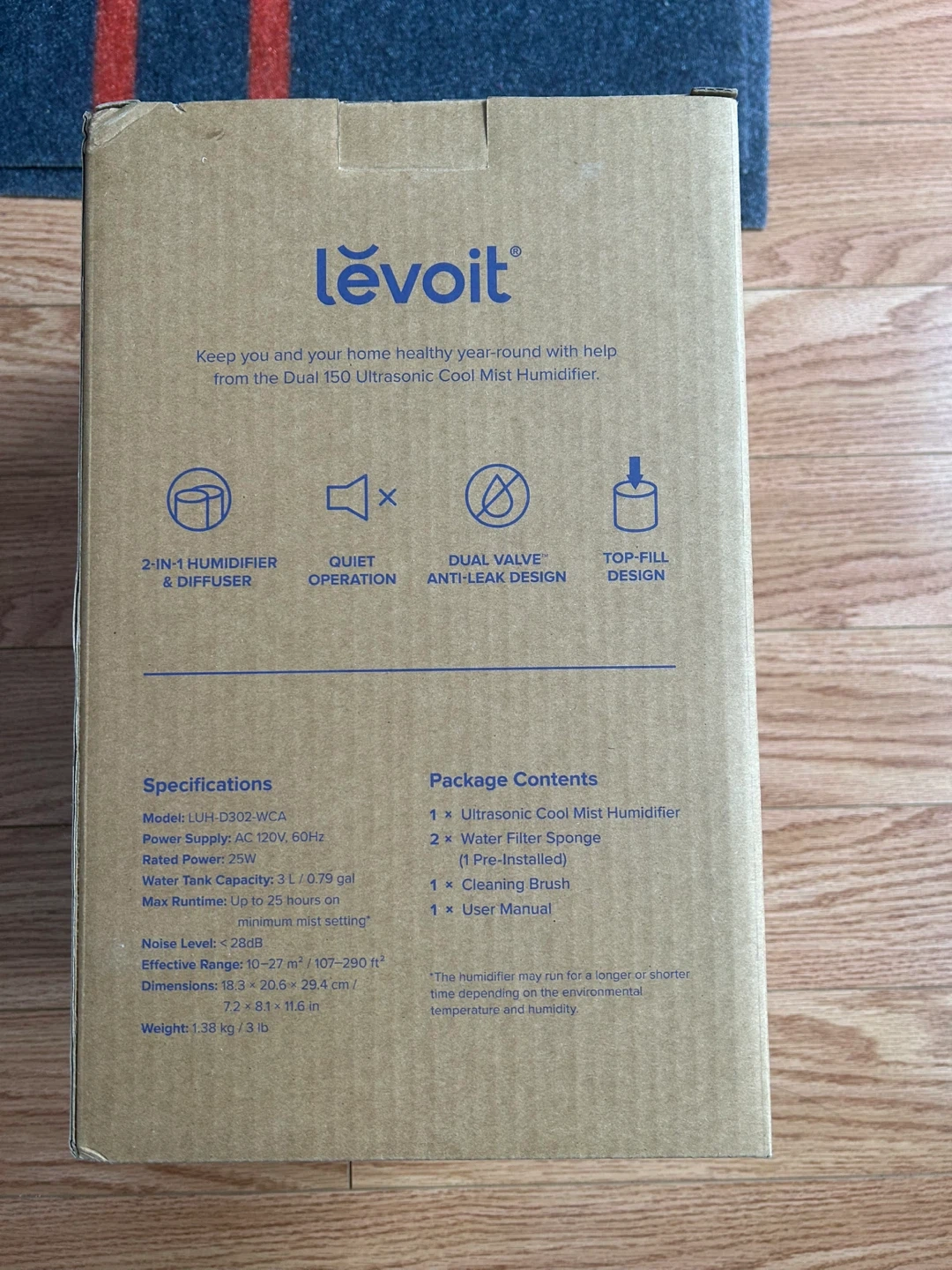 This Levoit Dual 150 Ultrasonic Cool Mist Humidifier comes in white. It features a top-fill design and dual valve anti-leak design for quiet operation. Package includes the humidifier, 2x water filter sponge, 1x cleaning brush, and 1x power adapter.
