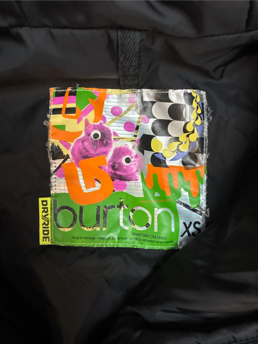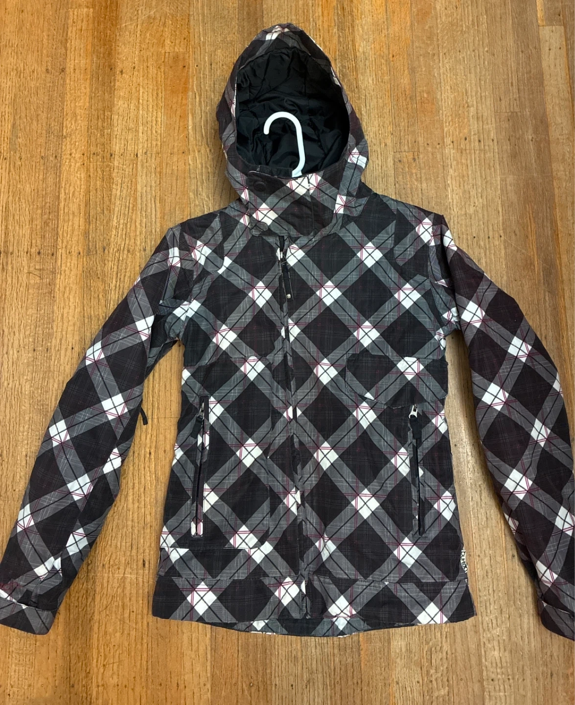 Burton hooded ski jacket in a plaid pattern. Size Ladies XS. It's designed with a full zip and zippered pockets. This jacket offers a stylish and functional outerwear option.