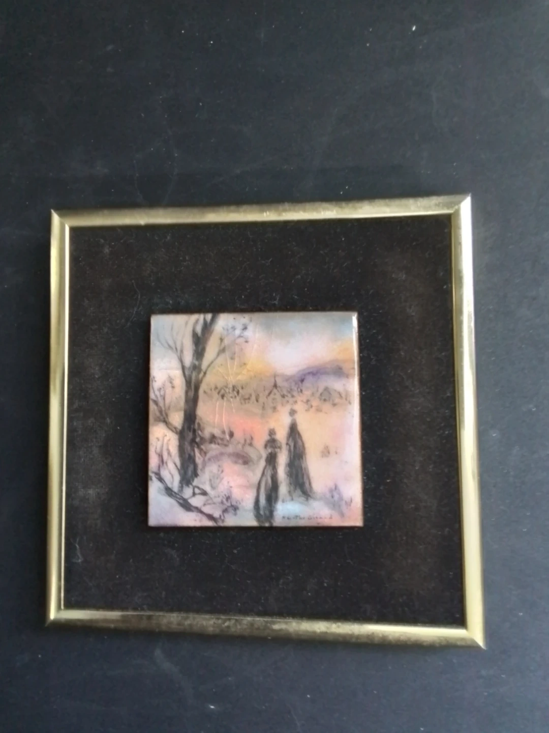 This is a scenic enameled painting on copper, signed by Marthe Girard, with dimensions of 6.5x6.5 inches. This vintage piece showcases a beautiful winter landscape with figures, capturing a serene and timeless scene. Note this is a used piece and has some cracking in the enamel.