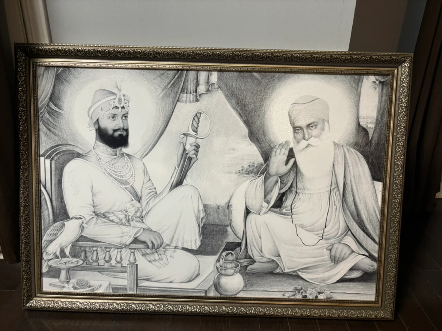 This framed print depicts Guru Gobind Singh Ji and Guru Nanak Ji. It's a detailed black and white illustration, perfect for display. The frame is ornate and complements the artwork beautifully.