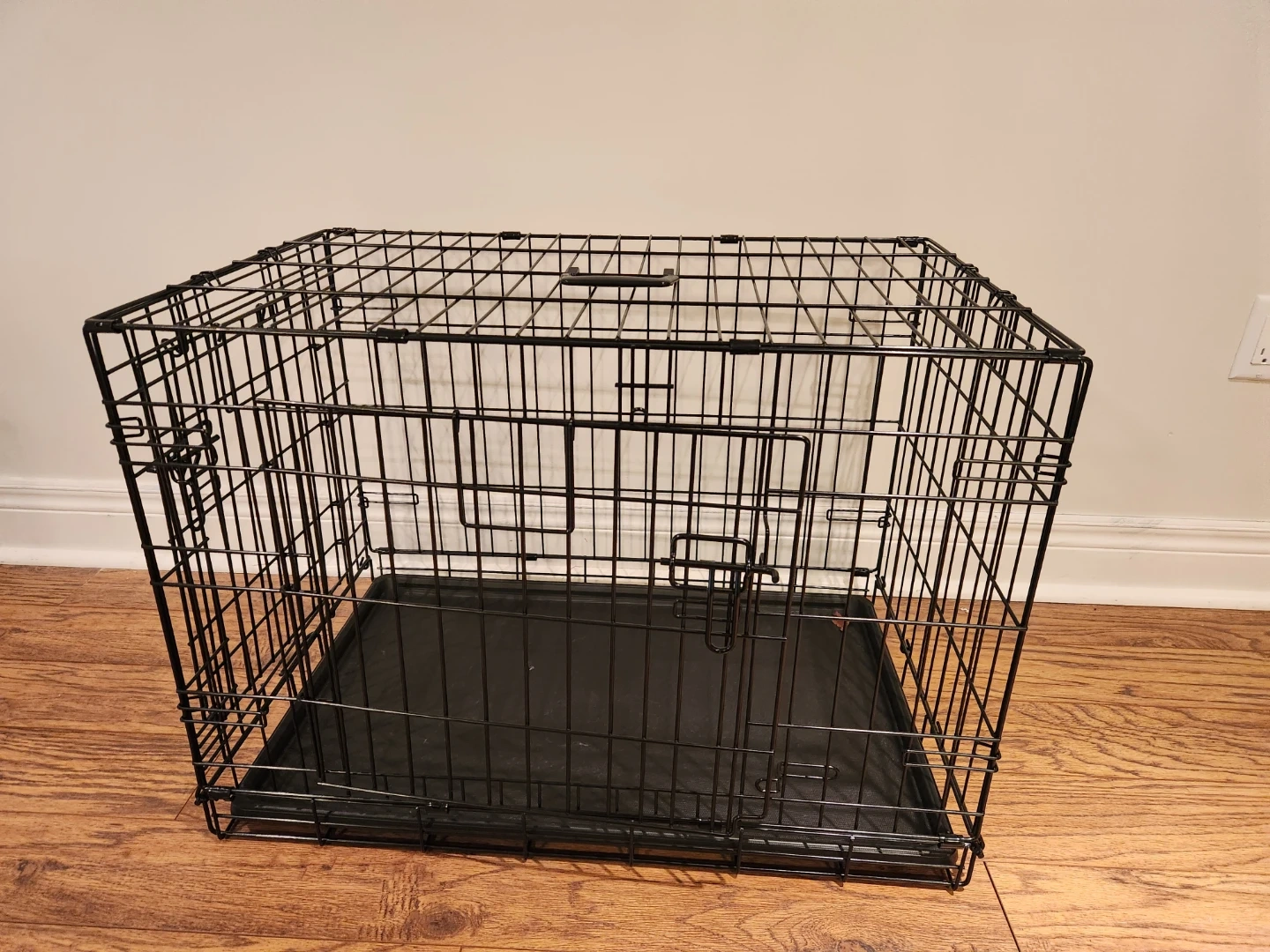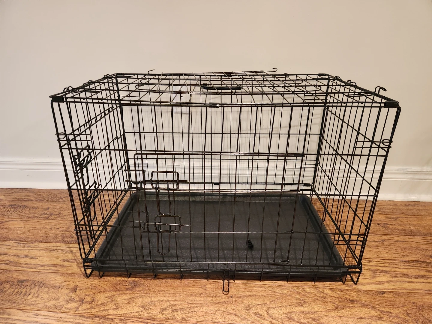 It's a foldable black wire dog crate with a removable plastic tray. It features two doors for easy access. It also comes with a divider