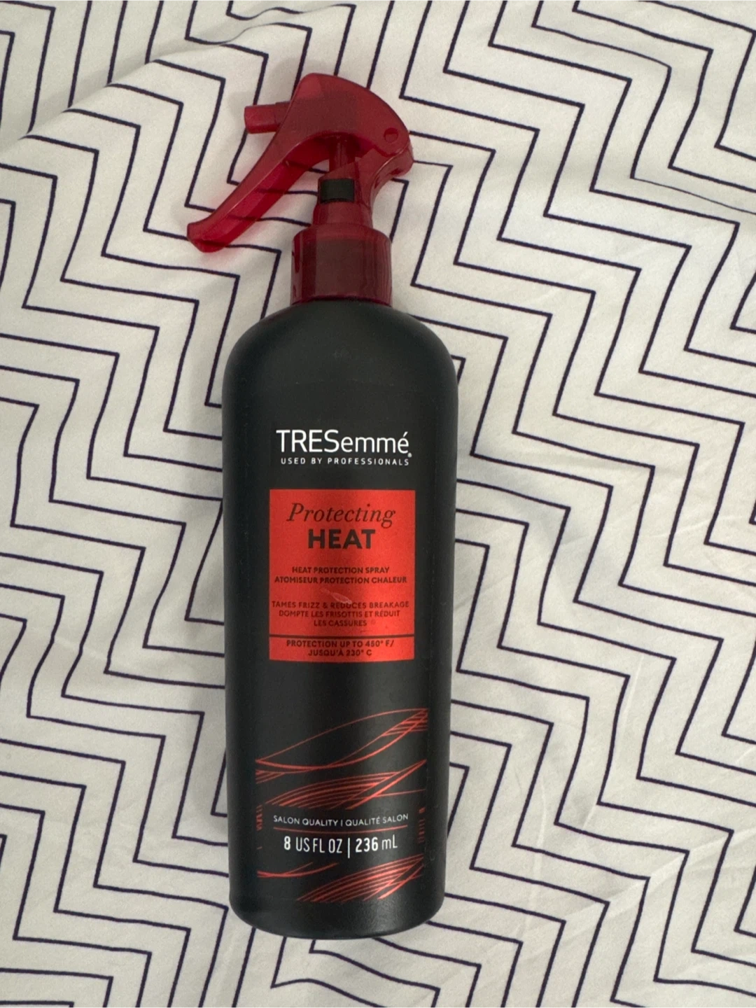 TRESemmé Protecting Heat spray tames frizz and reduces breakage. It offers protection up to 450°F/230°C. This is a salon quality spray, 8 US FL OZ | 236 mL.