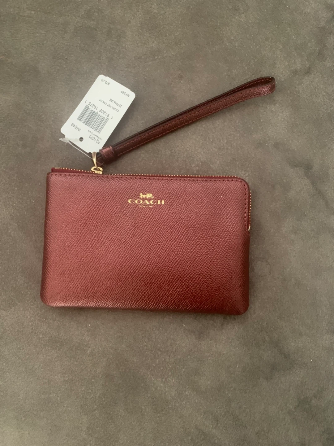 This is a Coach small zip wristlet in Metallic Cherry. It's made of crossgrain leather. Includes original tag with $75 MSRP.