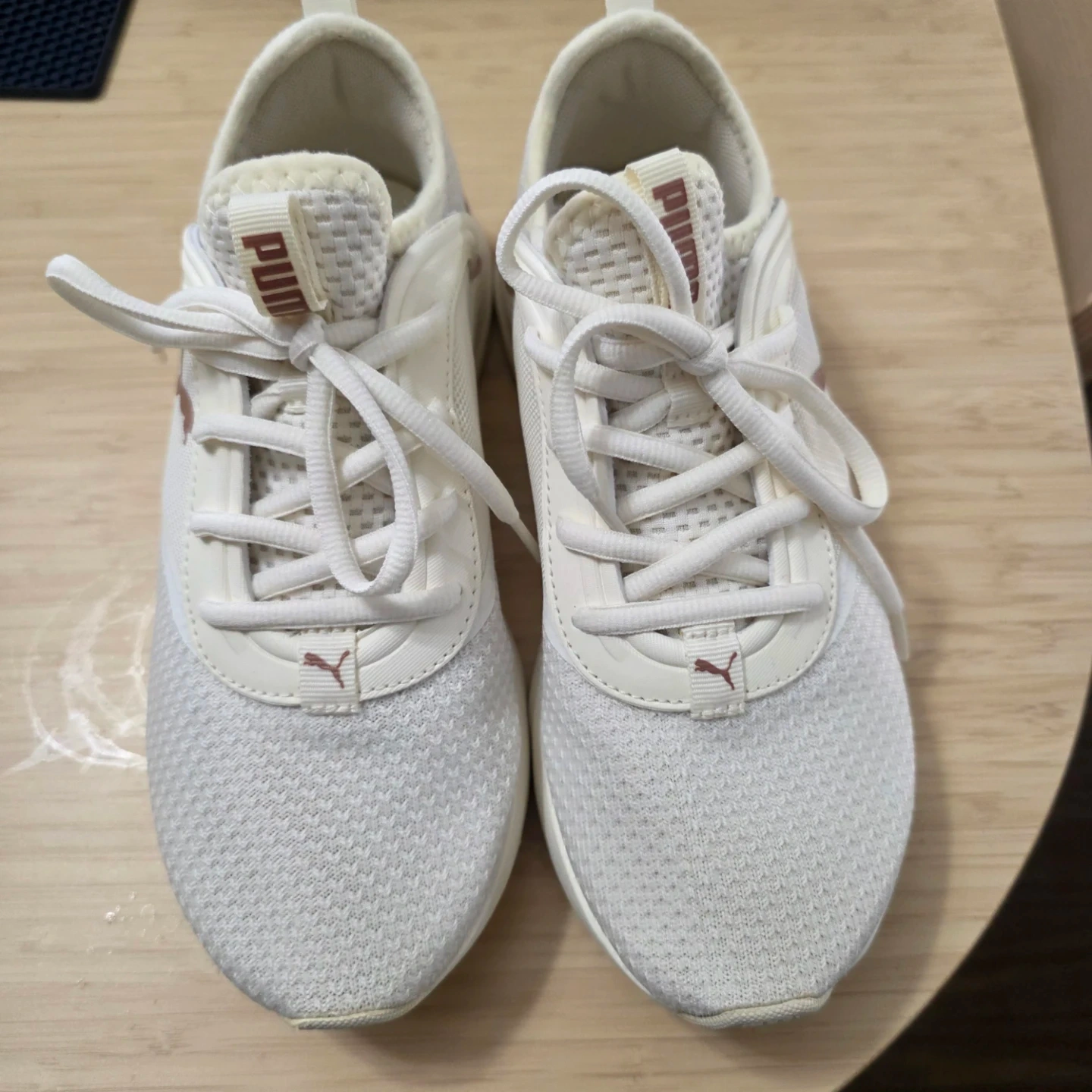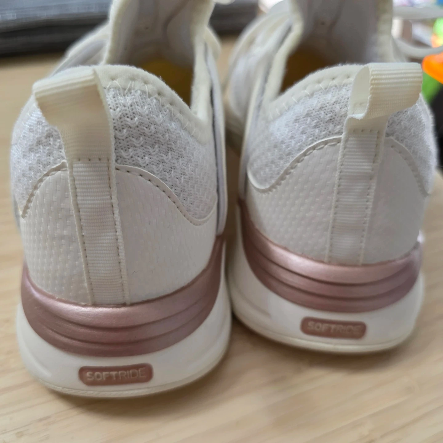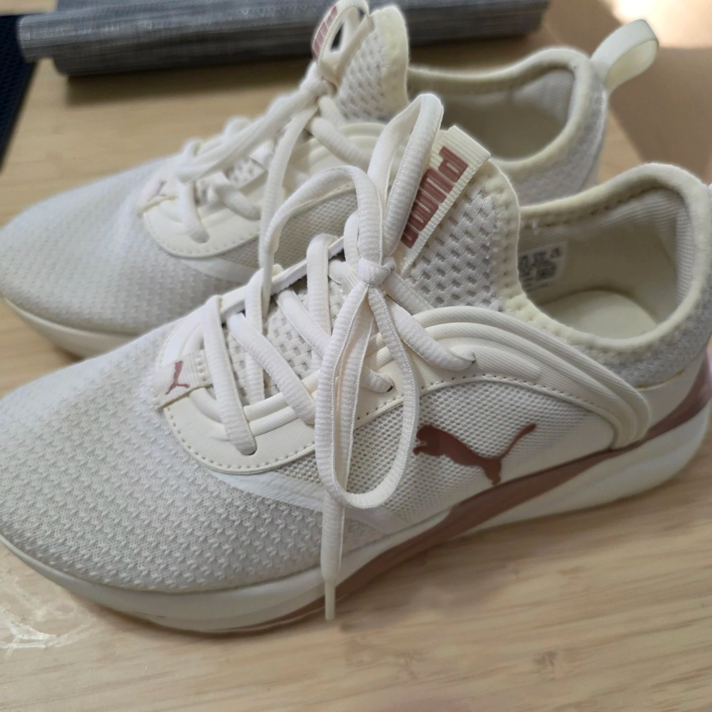 These Puma Softride running shoes are a stylish white with rose gold accents. They feature a breathable mesh upper and a comfortable Softride sole for everyday wear. Great for light jogs or walking!