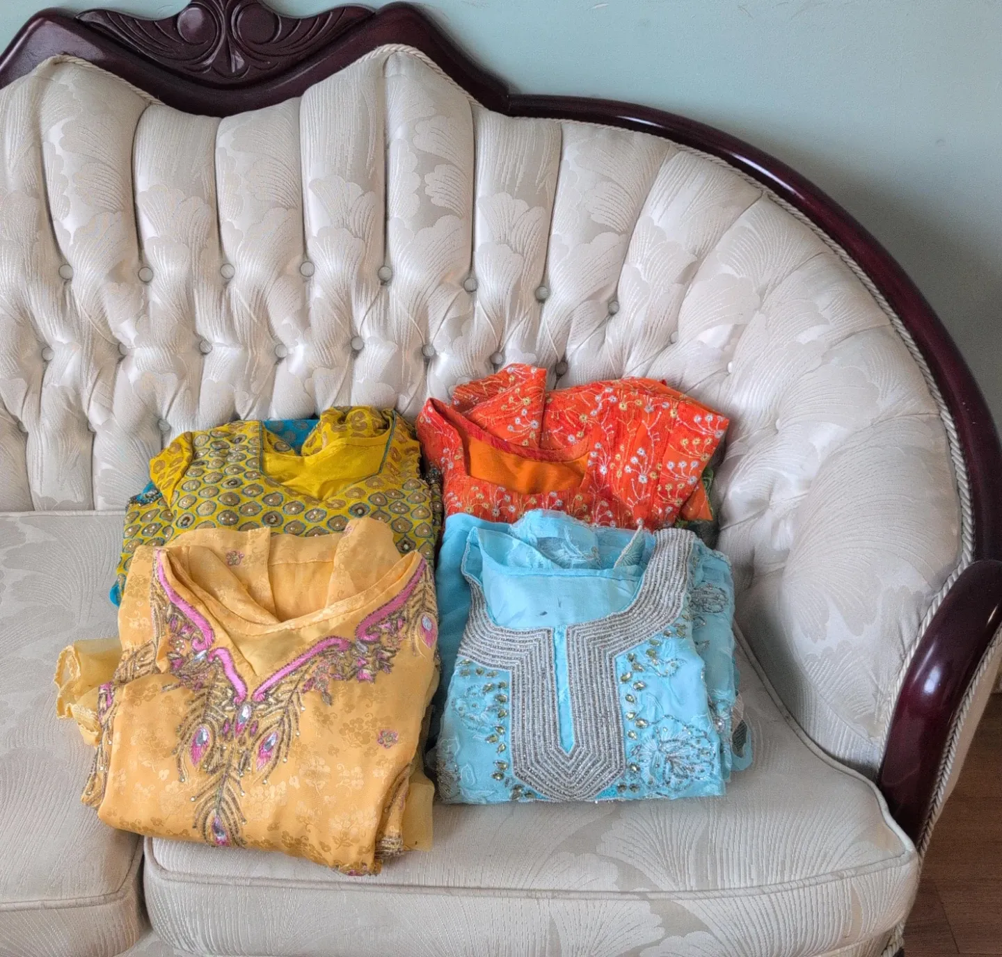 Four colourful women's tunics. Features intricate embroidery and beadwork. Materials appear to be silk or a similar synthetic blend. Sizes are not indicated, but they look like medium to large.