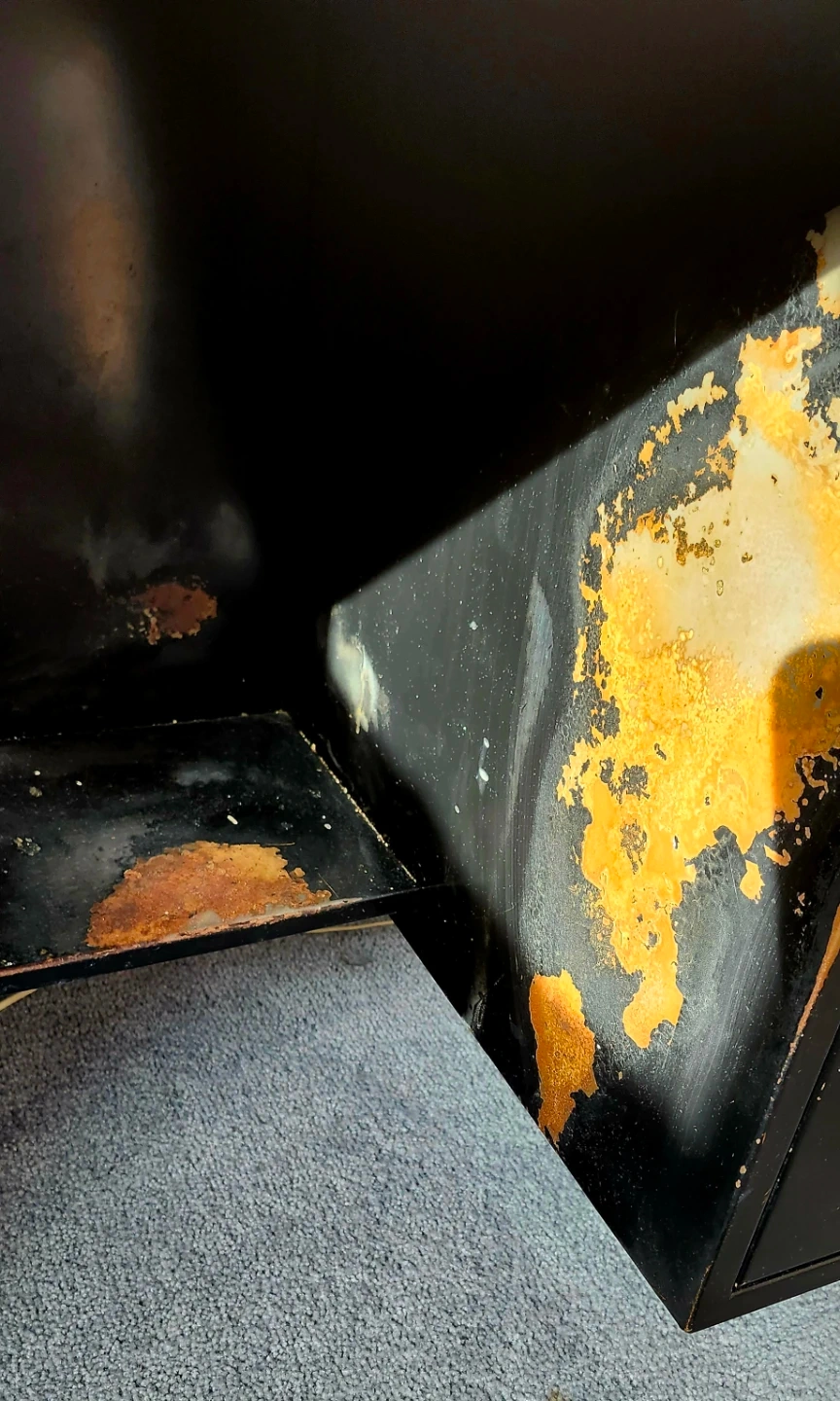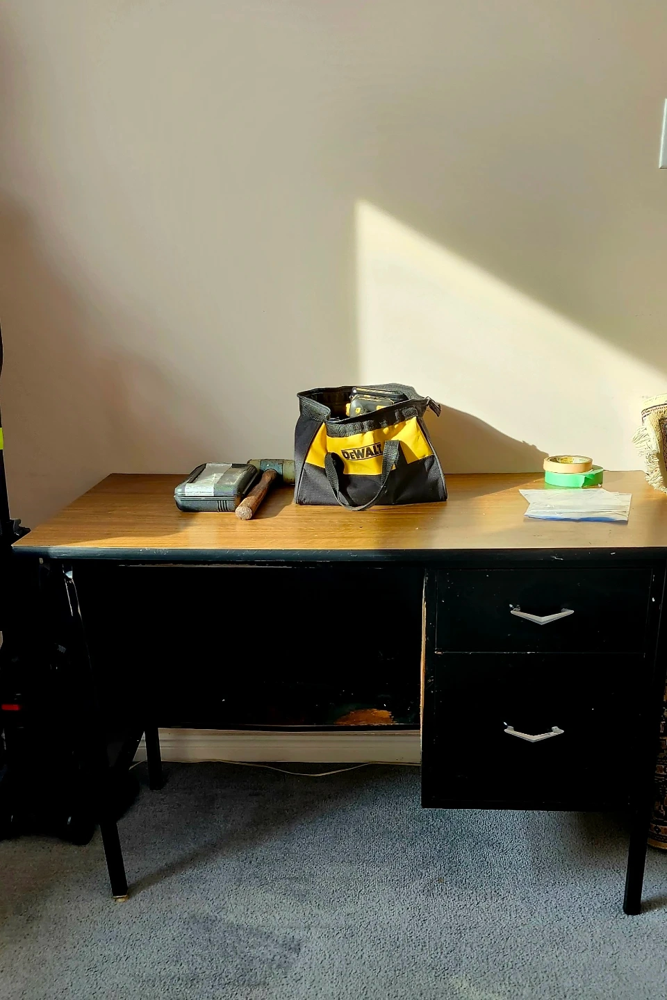 This is a vintage 80s metal desk with two drawers on the right side. It has a wooden laminate top and black painted metal body. Some wear and rust are visible on the metal parts. Needs TLC. This desk is suitable for a home office or workshop.