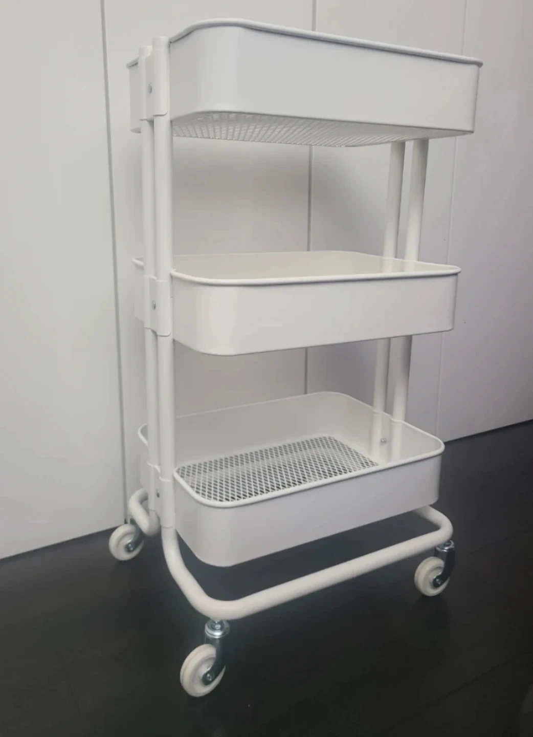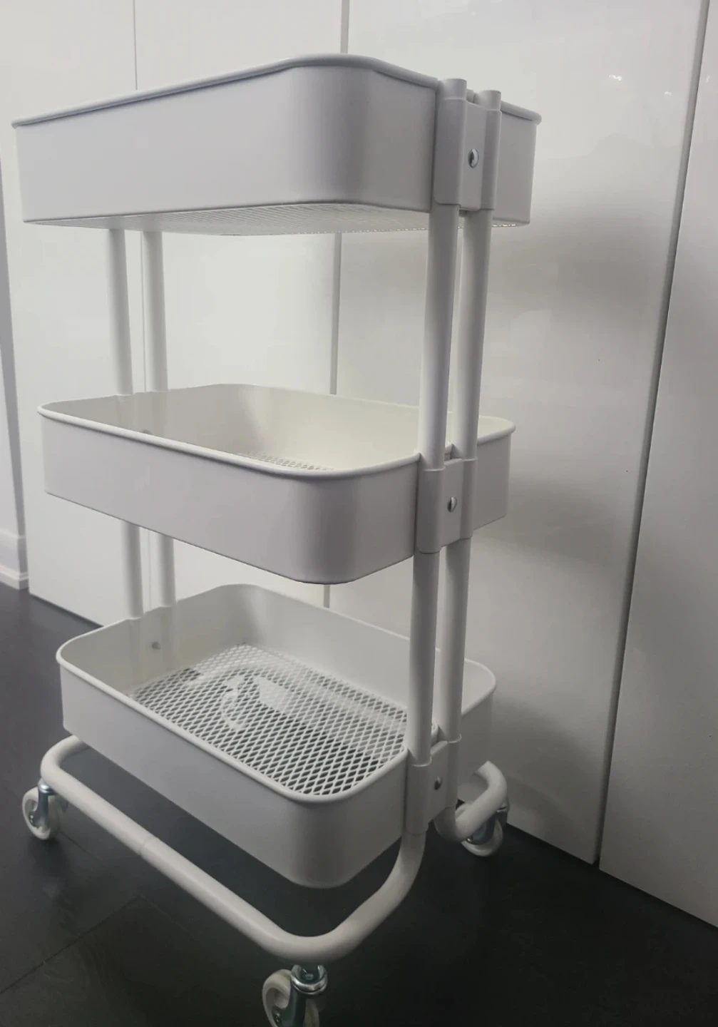 This is a white 3-tier rolling utility cart. It's made of metal with a powder-coated finish. The cart has wheels for easy movement. Perfect for organizing items in a kitchen, bathroom, or craft room!