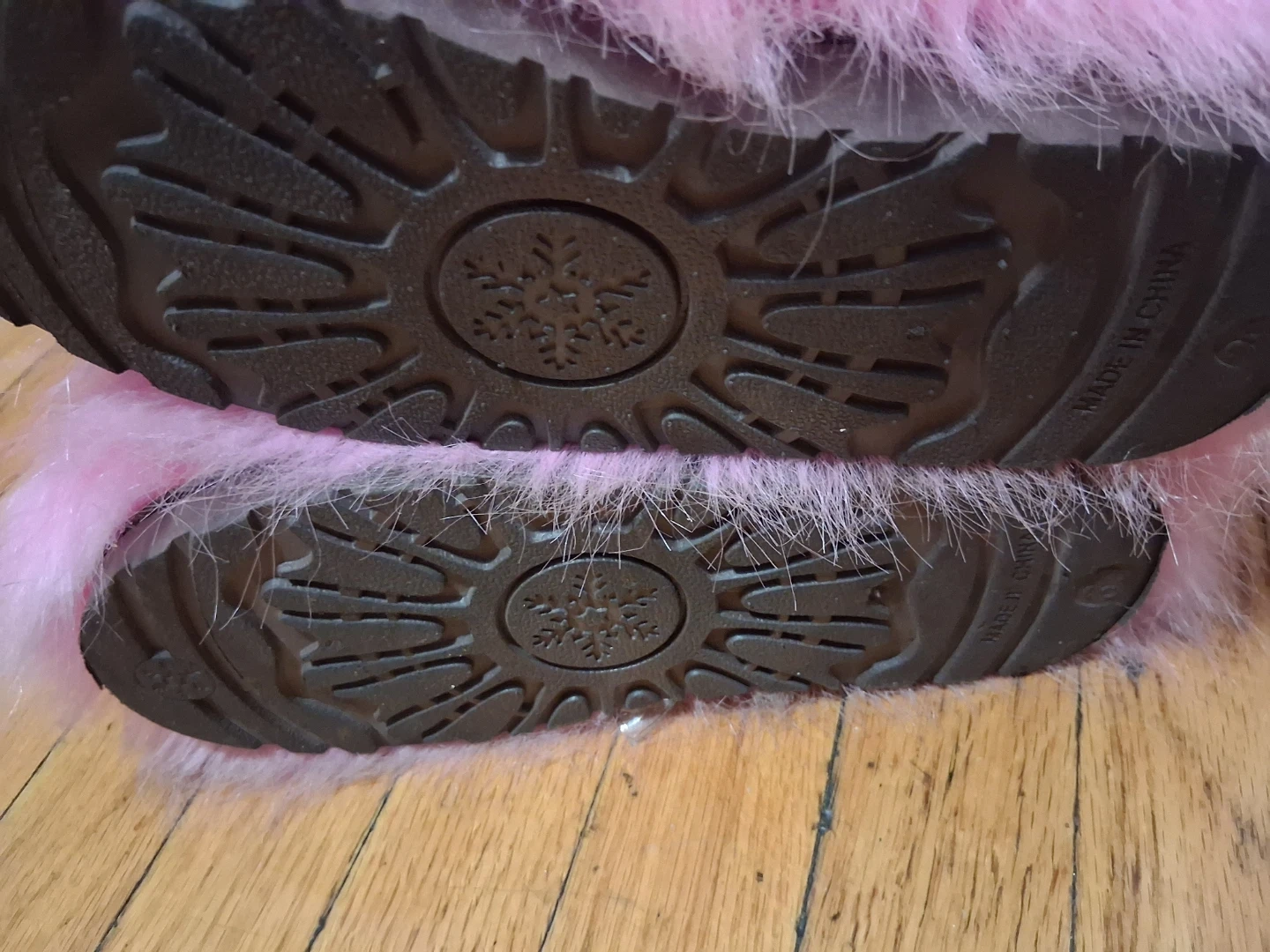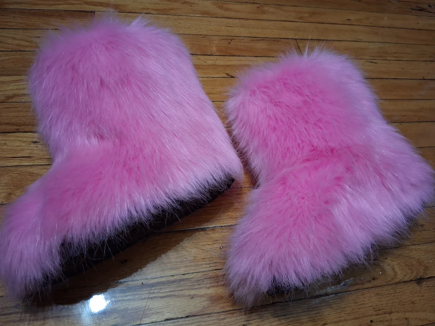 Cozy pink faux fur boots for keeping your feet warm! Features a durable sole for indoor and outdoor wear. Made in China.