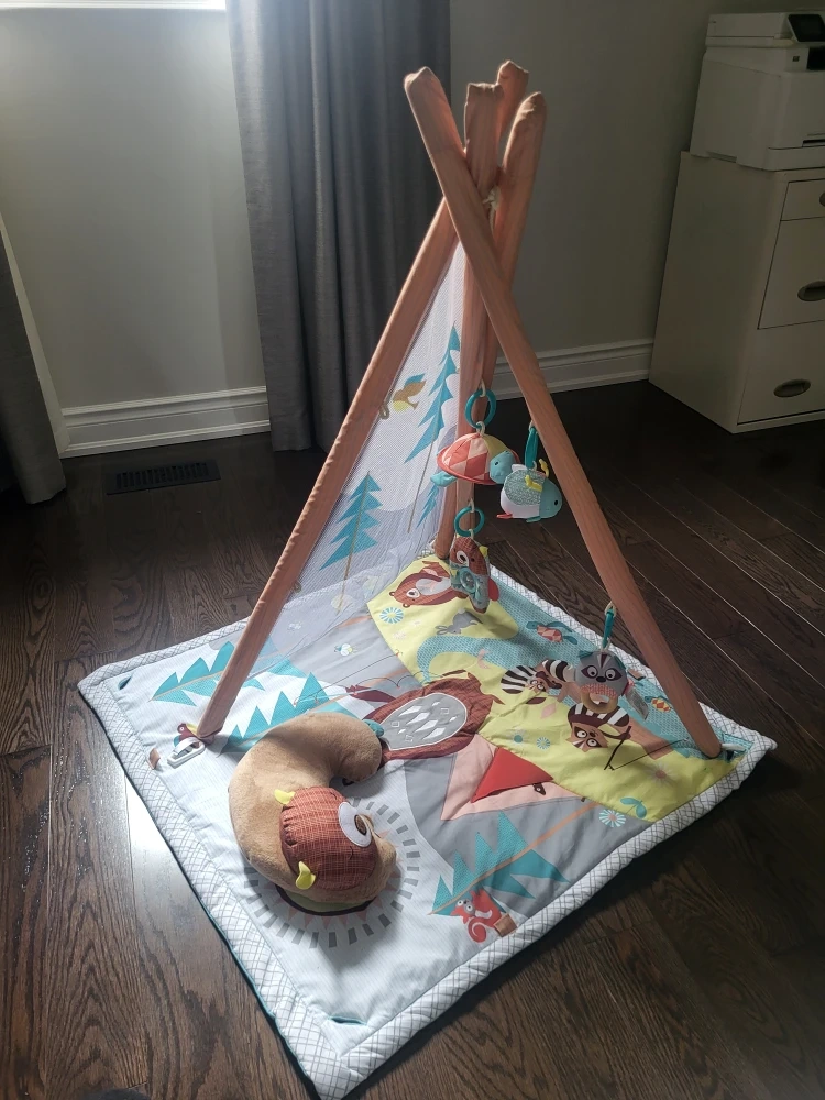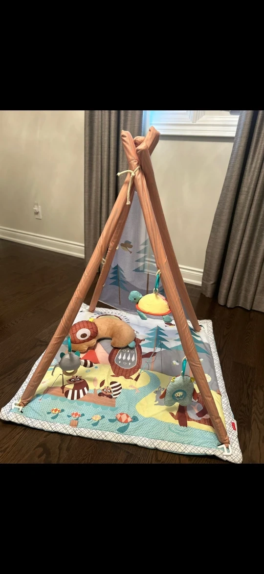 This Fisher-Price play gym features a cute woodland theme with hanging toys. It includes a soft mat and a teepee-like structure with wooden poles. The play gym offers a comfortable space for babies to explore.