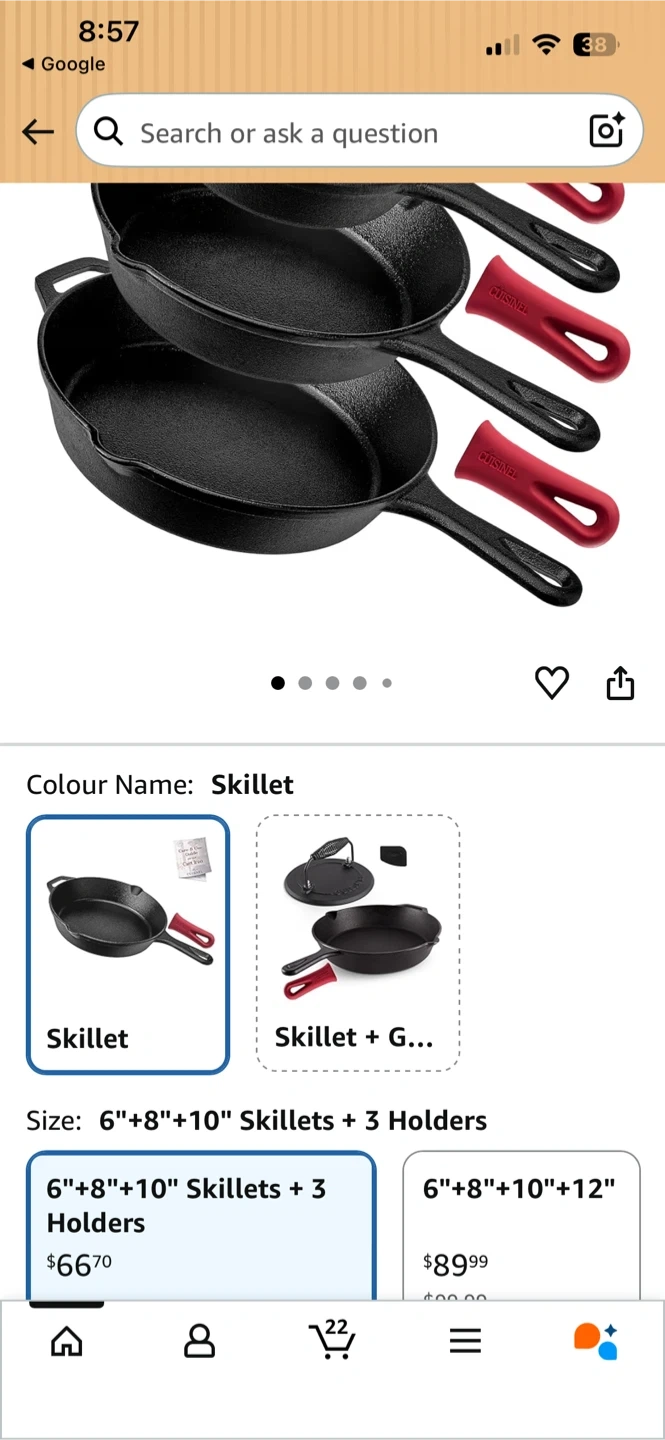 Sizes include 6-inch, 8-inch, and 10-inch skillets. Durable cast iron construction for even heating. Great for everyday cooking!