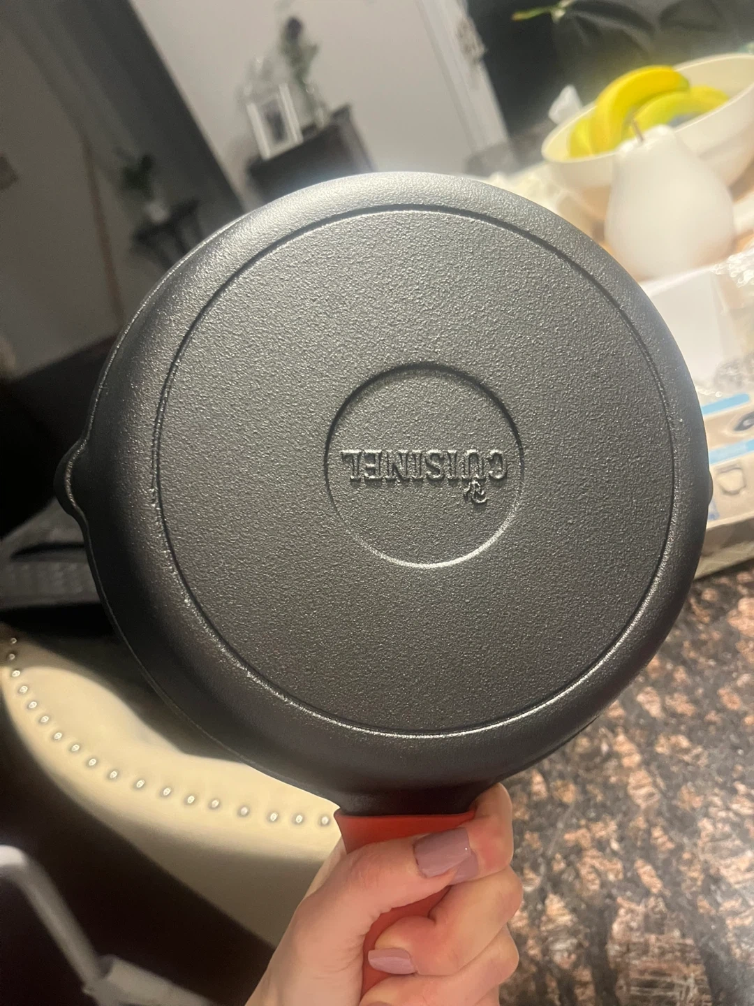 Set of three Cuisinel cast iron skillets with red silicone holders. One red holder is missing .