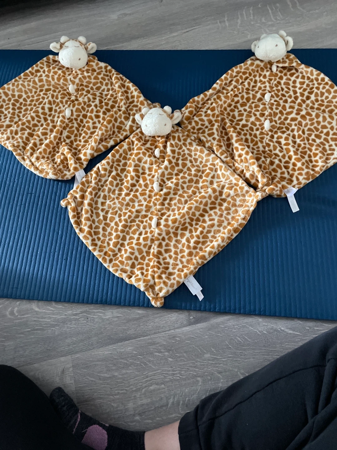 Three soft, plush giraffe lovey security blankets. Each features a cute giraffe head and the classic giraffe print pattern. Perfect for little ones to cuddle and soothe themselves.