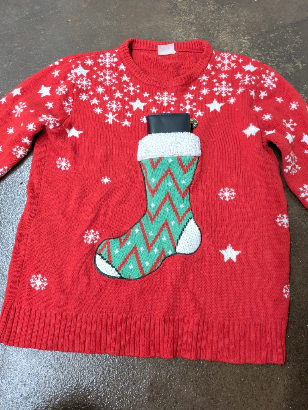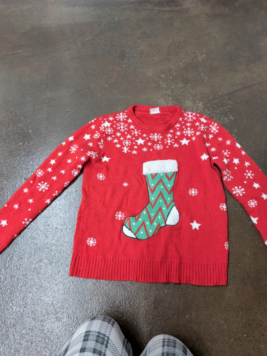 This festive red sweater features a fun Christmas stocking design with snowflakes and stars. It's perfect for holiday parties or casual wear during the winter season. A unique piece for your festive wardrobe!