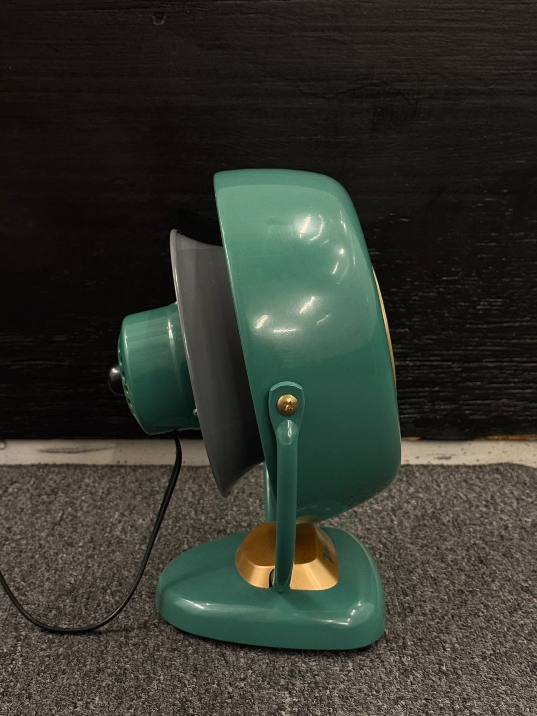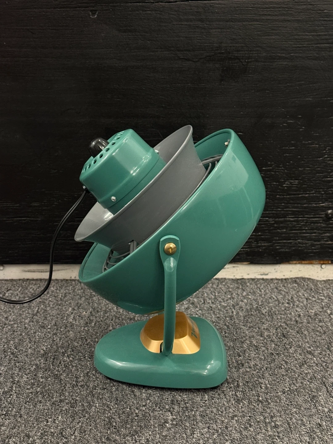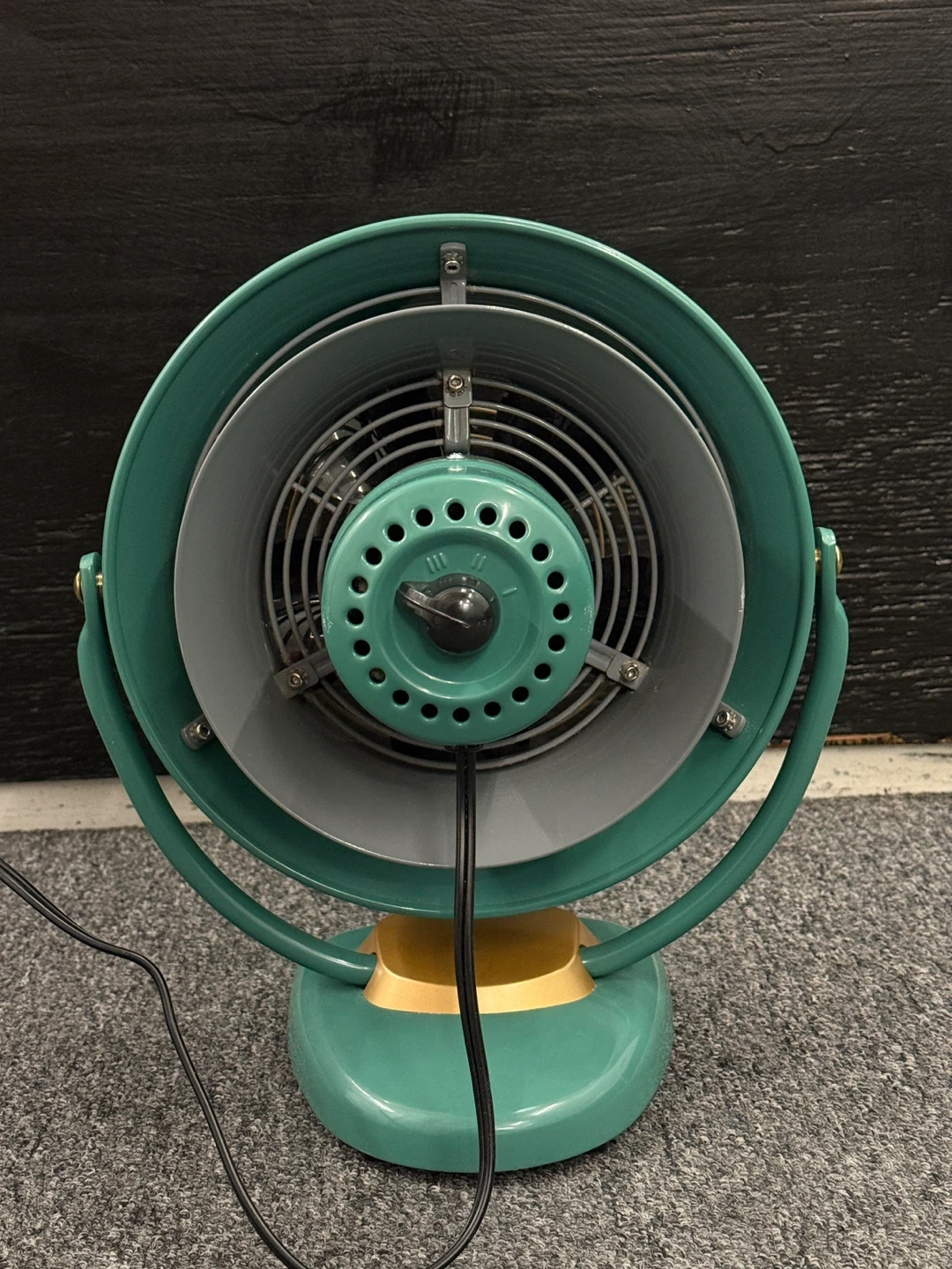 This is a vintage Vornado desk fan in a teal color. It's a unique decorative piece. The fan is made of metal. Originally $169