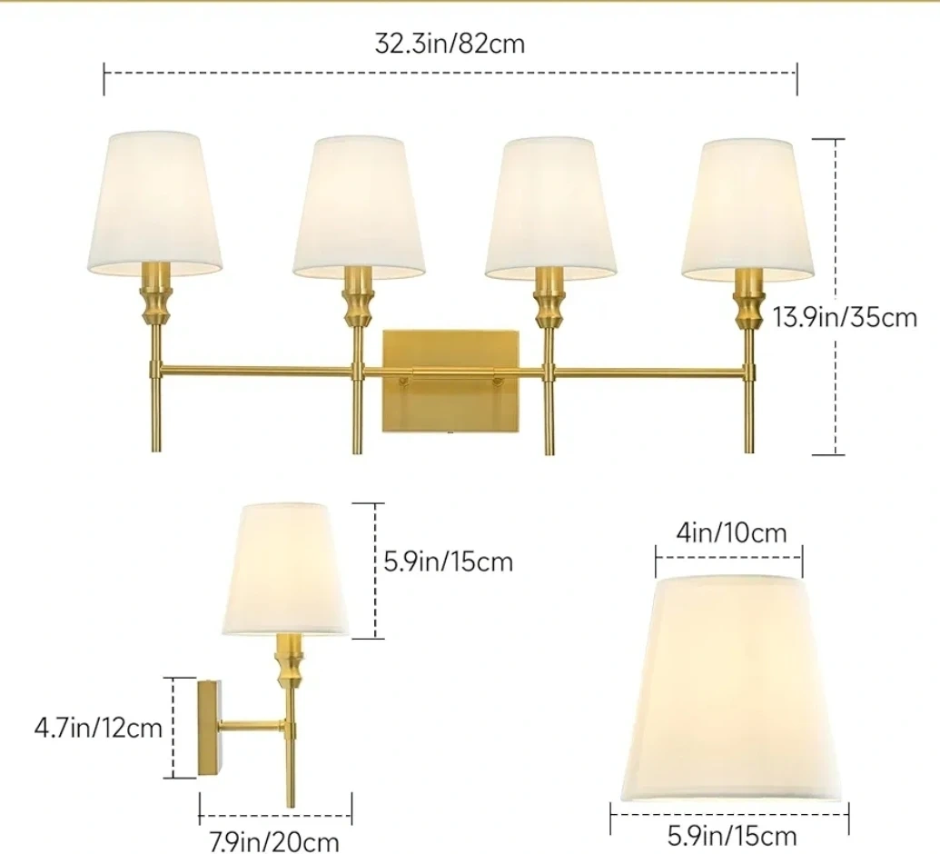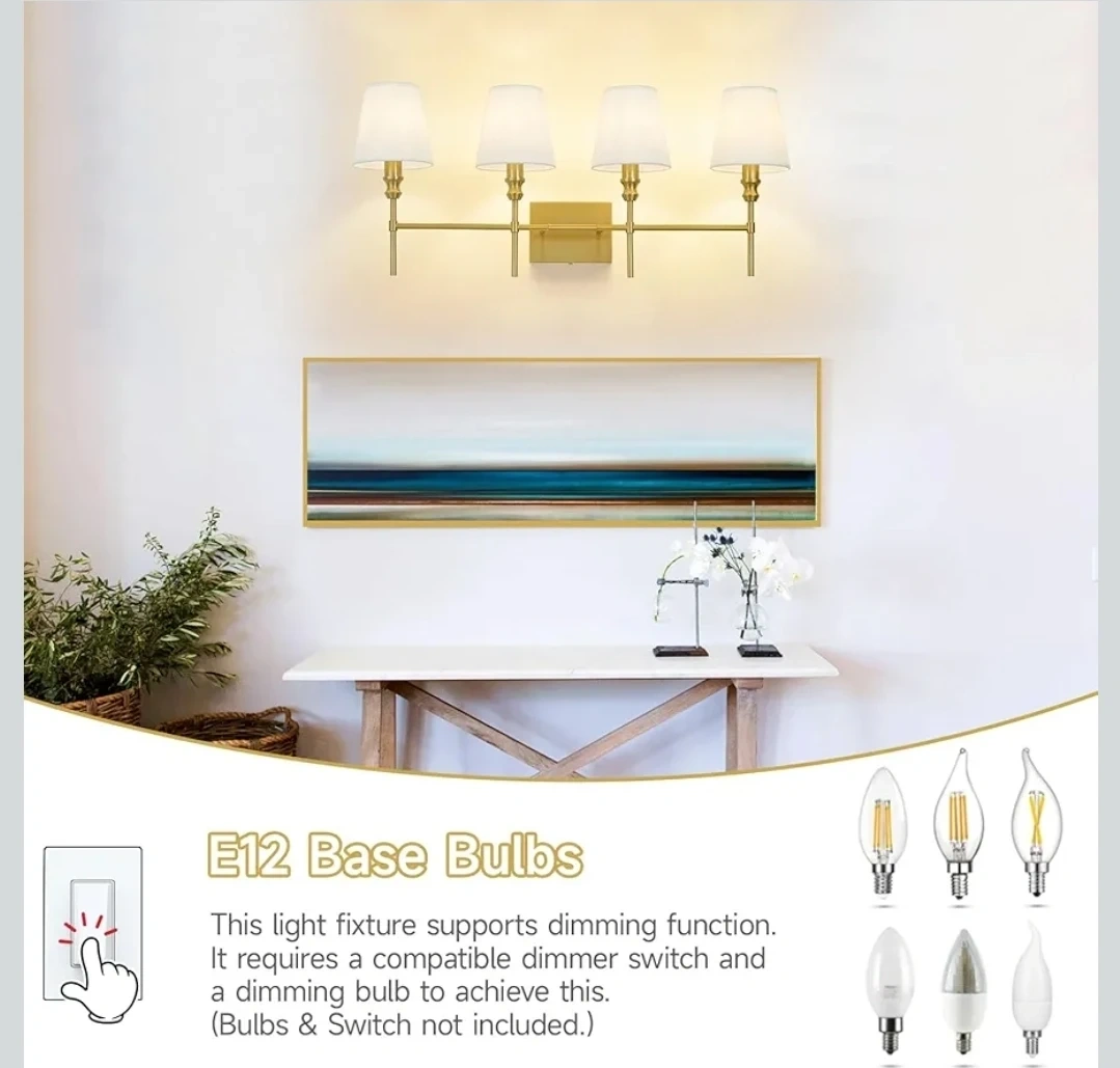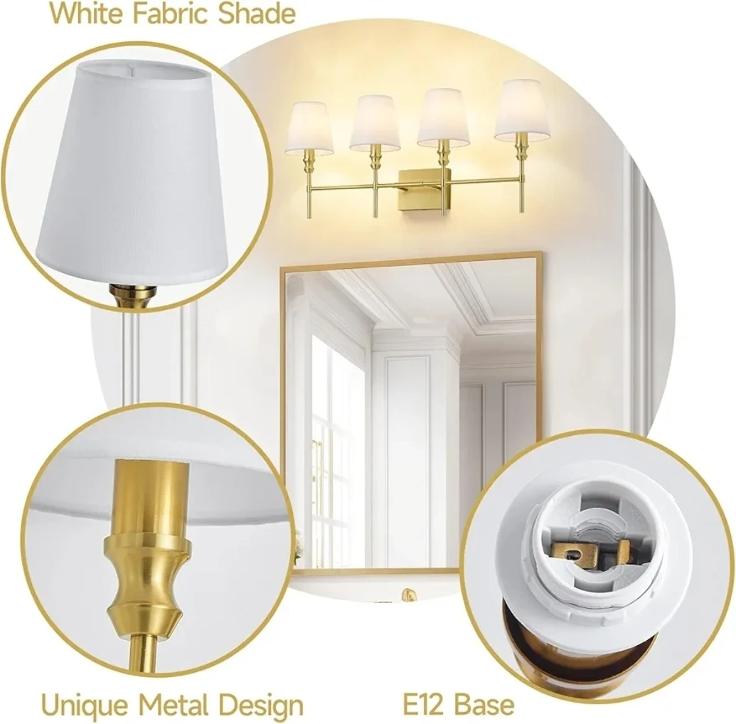This is a ZSMAIKU 4-light brass bathroom light fixture with white fabric shades. It has an E12 base and supports dimming function with a compatible dimmer switch and bulb. Overall dimensions are 32.3in wide and 13.9in high.