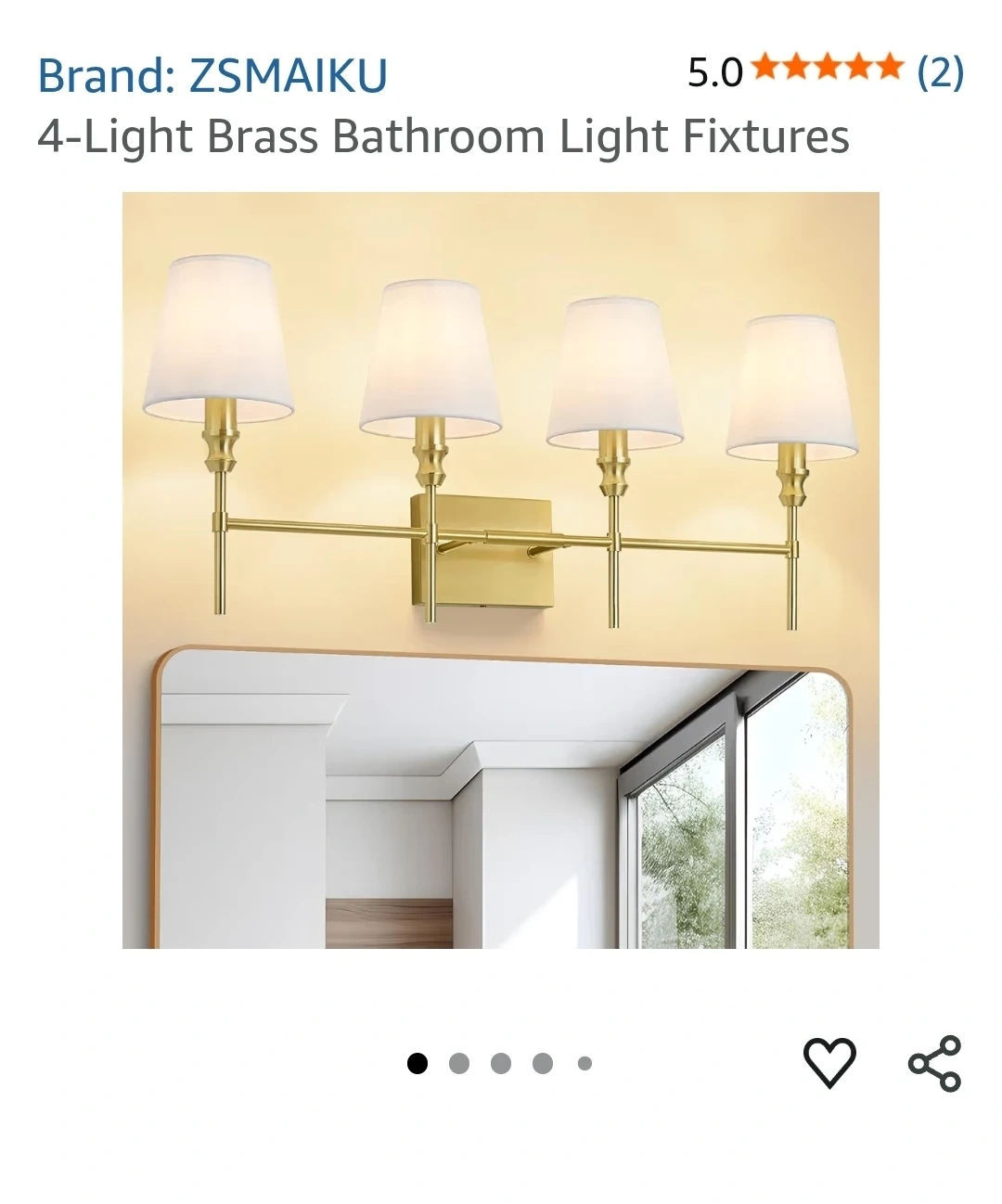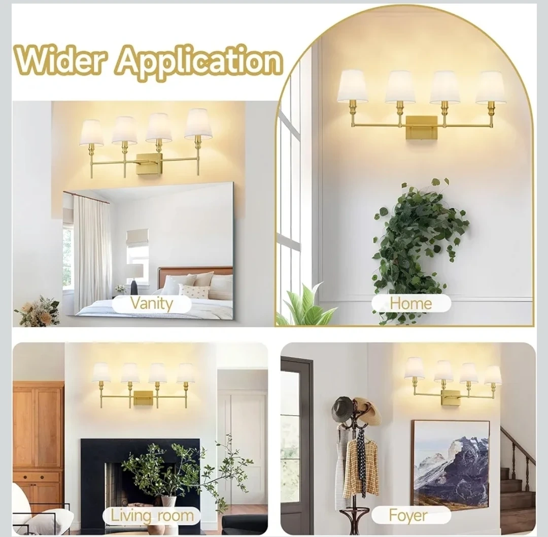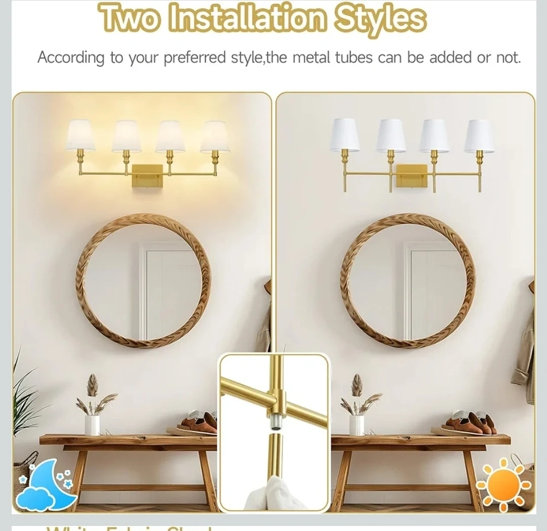 This is a ZSMAIKU 4-light brass bathroom light fixture with white fabric shades. It has an E12 base and supports dimming function with a compatible dimmer switch and bulb. Overall dimensions are 32.3in wide and 13.9in high.