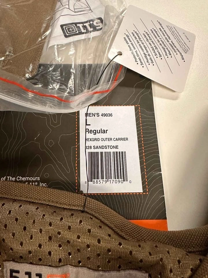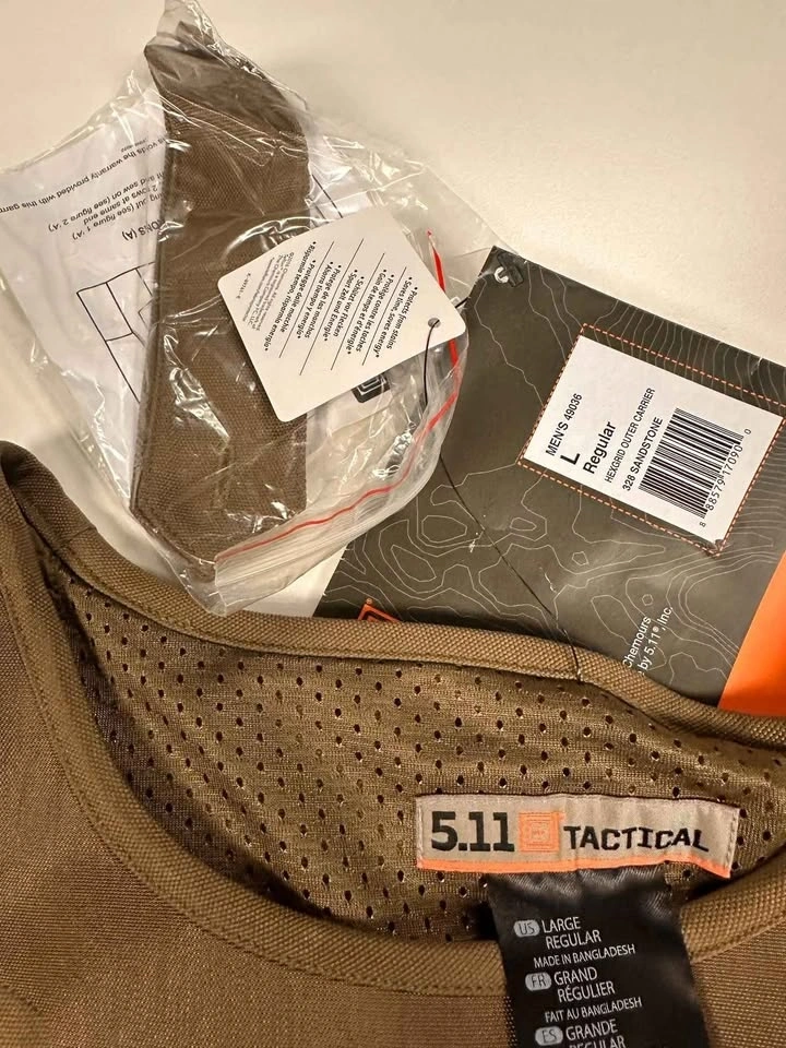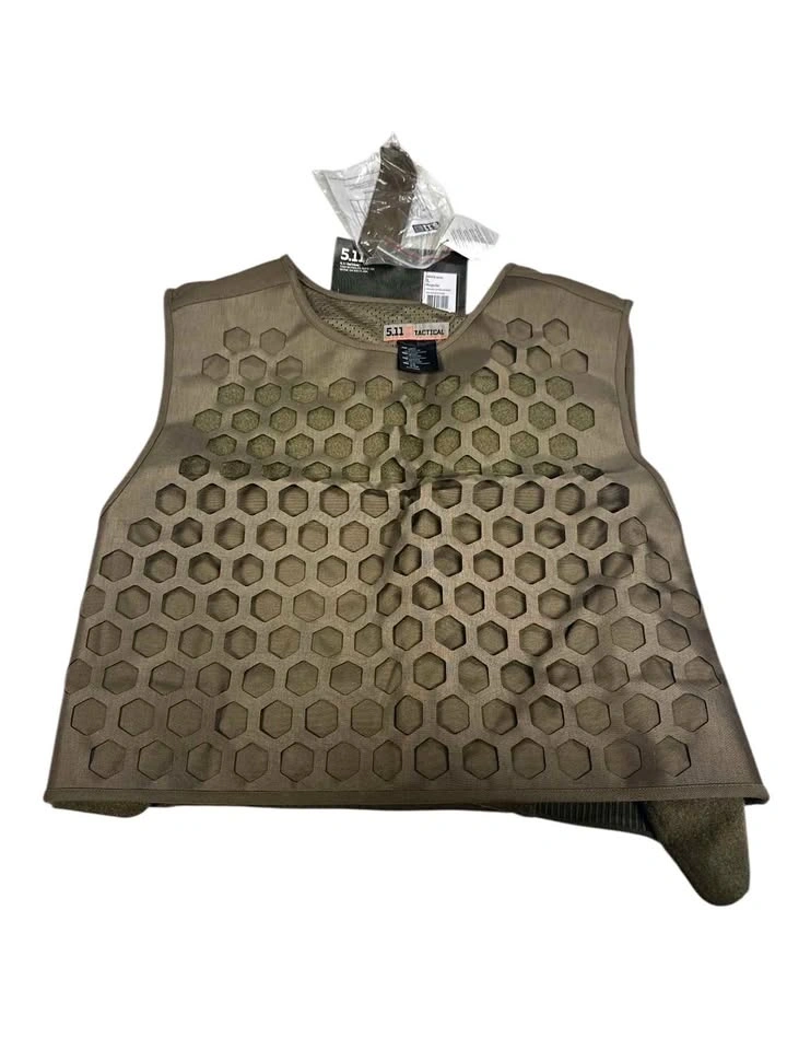 Brand new 5.11 Tactical Hexgrid Outer Carrier vest. Size L, color is Sandstone. Features the hexgrid pattern on the front and a velcro patch on the back. Still has tags on it.