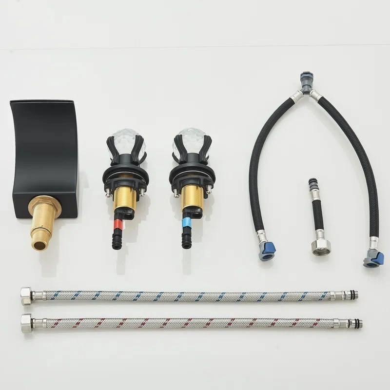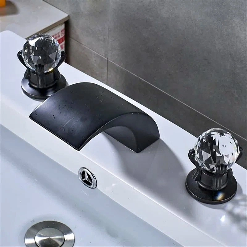 This 3-hole widespread bathroom faucet features dual crystal handles and a waterfall spout. It's made of 100% brass for durability and has a minimalist look. The waterfall flow reduces noise. LED lights add a modern touch. Hot and cold water are controlled by the dual handles. The faucet handles can be installed between 8 and 16 inches apart for a customized fit.
