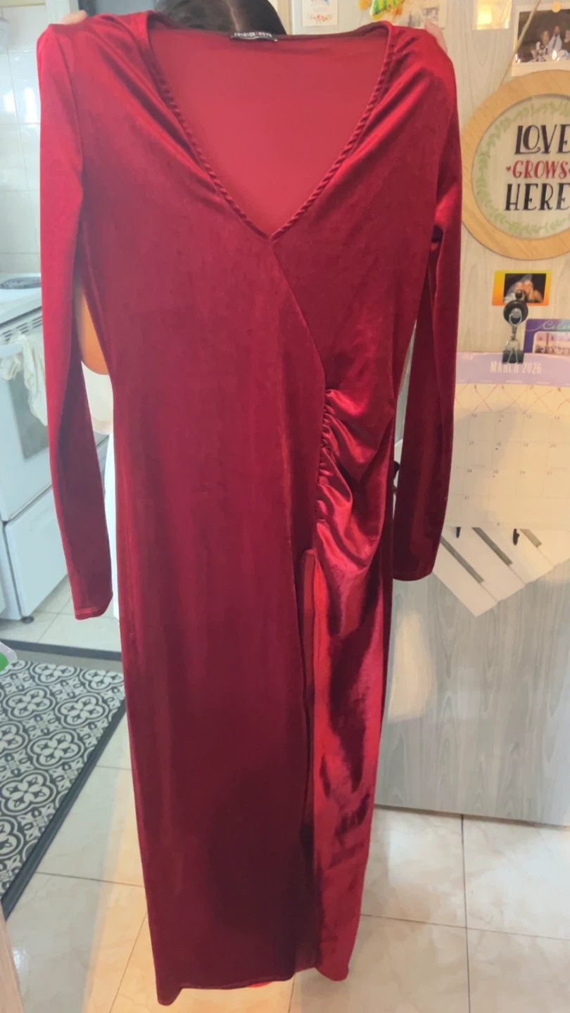 This is a long-sleeved red velvet dress. It features a V-neckline with braided trim and ruching on the side. Material is soft velvet. #freecycle