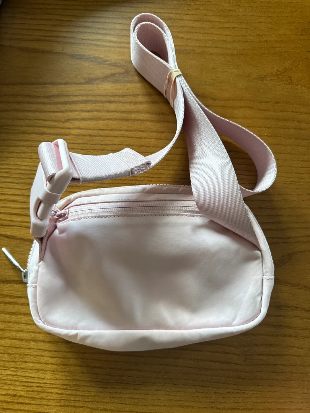 This Lululemon Everywhere Belt Bag is a pale pink colour. It's perfect for carrying your essentials on the go. A great everyday bag!