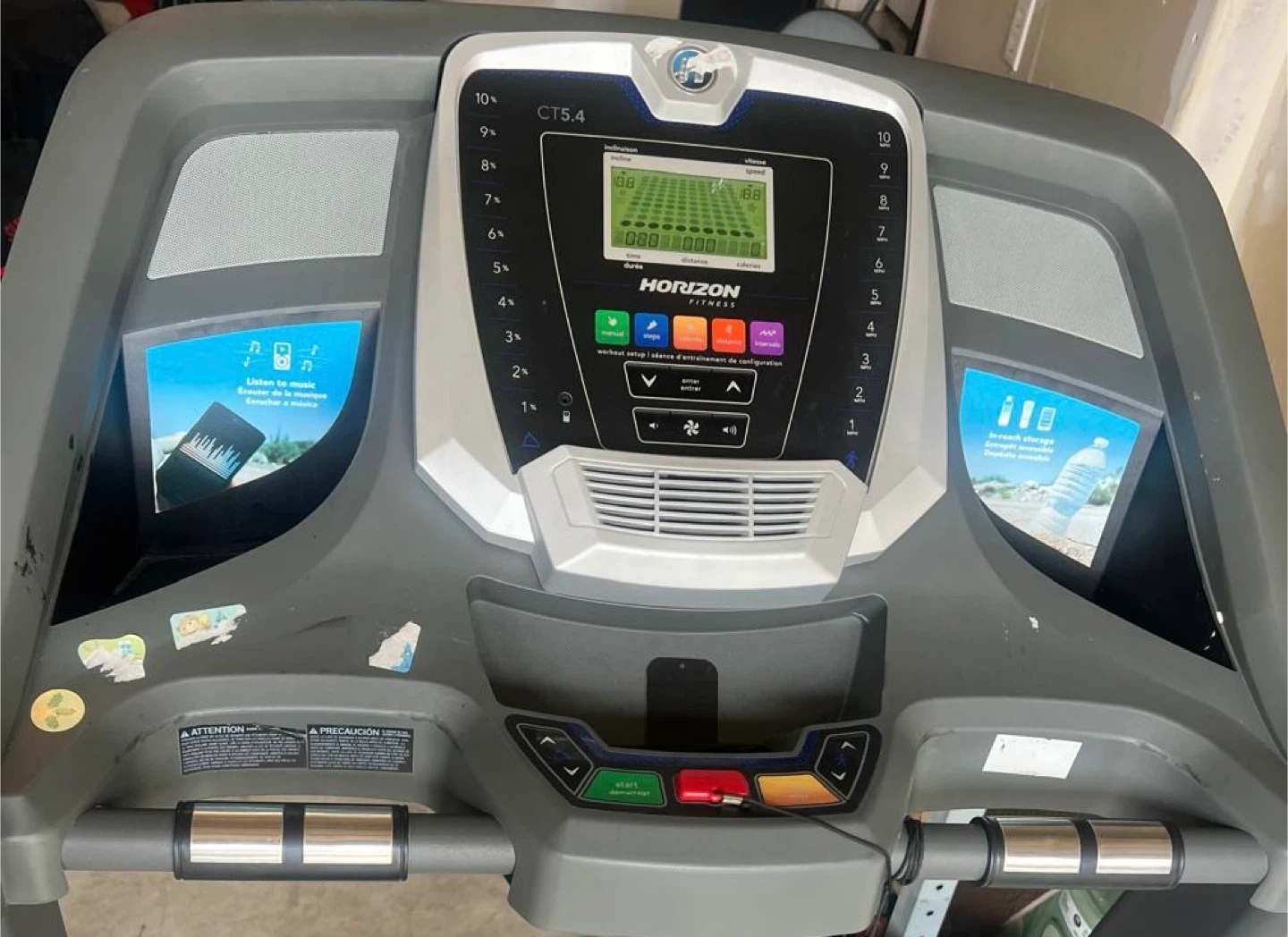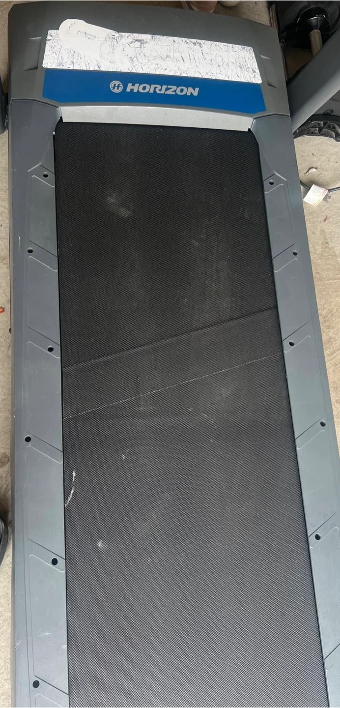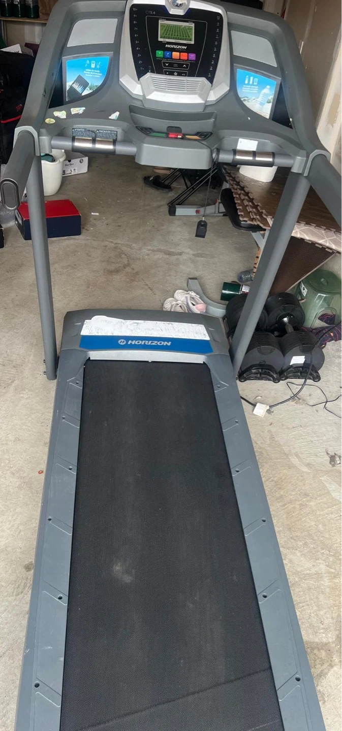 Horizon Fitness CT5.4 treadmill in good working condition. It has a digital display showing speed, distance, and time. There are pre-set workout programs. This treadmill is great for home cardio workouts.