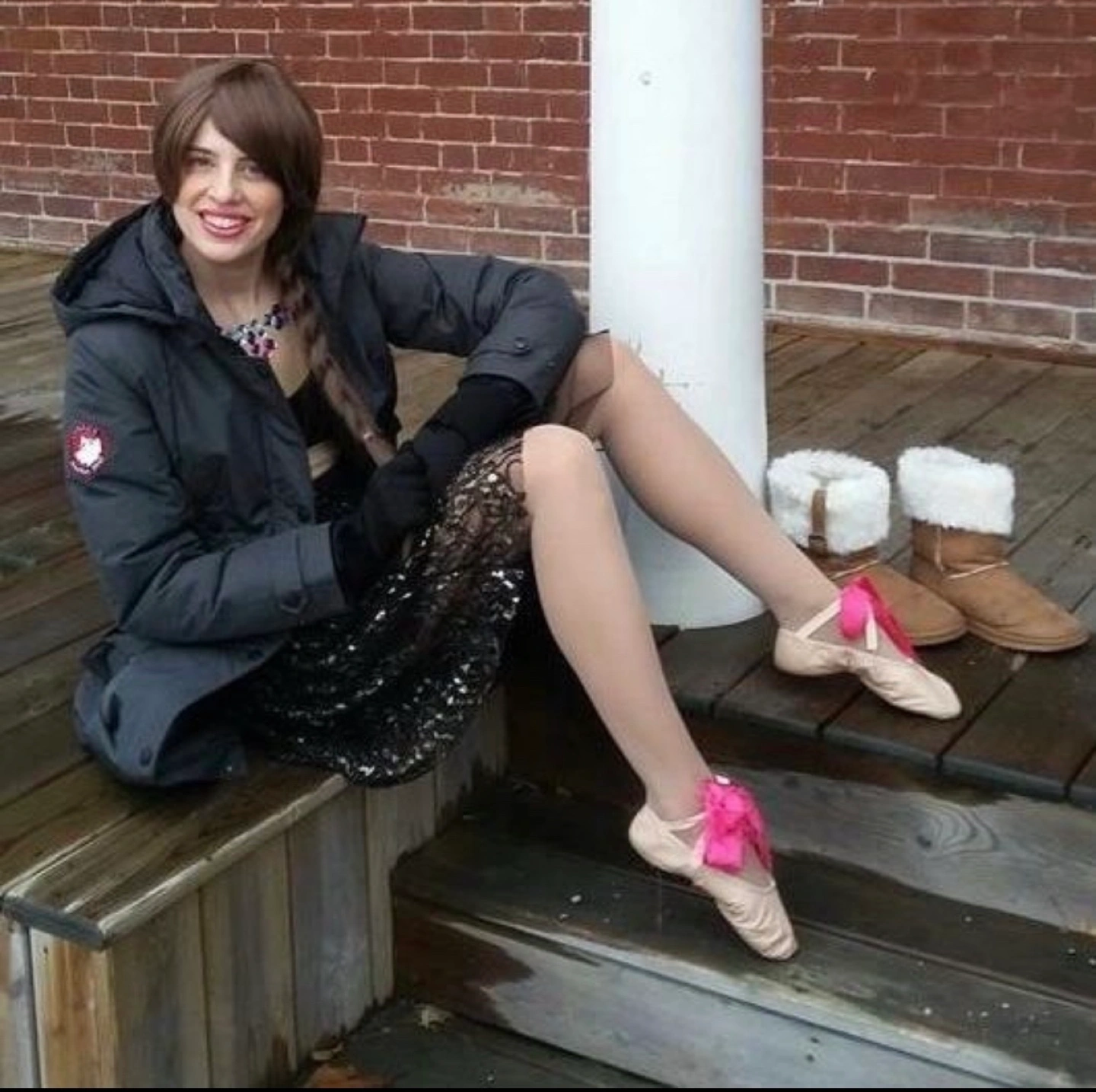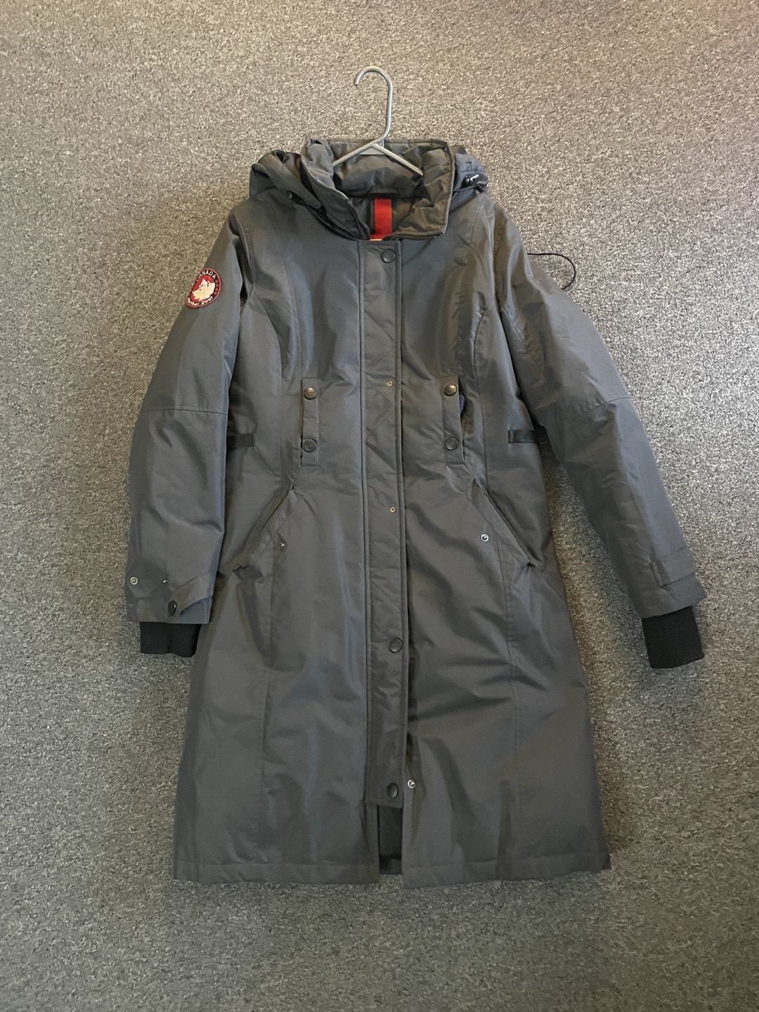 Long winter coat with a hood. Grey in colour. Features a zipper and button closure, multiple pockets, and a drawstring waist. Bought for 700$!