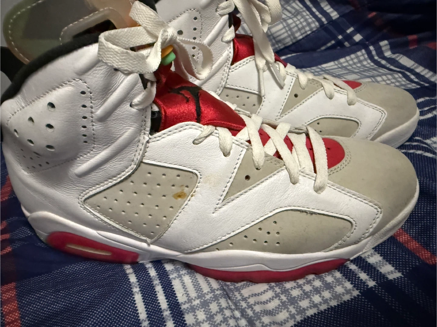 Classic white, grey, and red Air Jordan 6 Retro sneakers. These shoes feature a leather and suede upper with iconic Jordan branding. Great for collectors and sneaker enthusiasts!