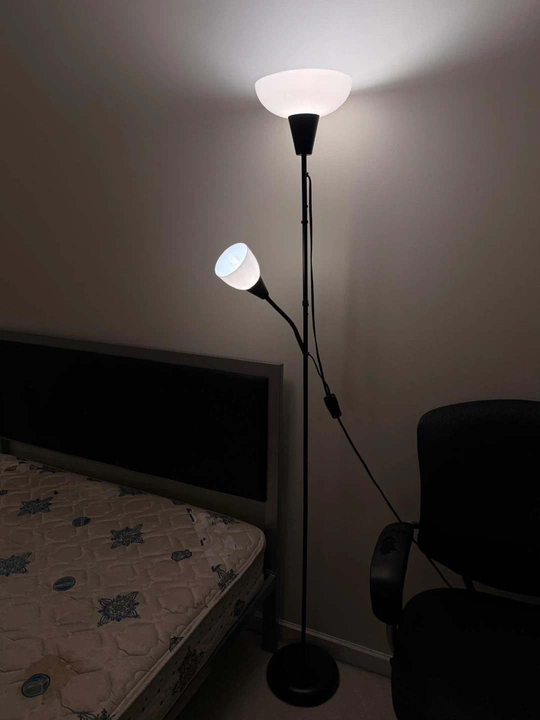 This black floor lamp features a main upward-facing light and a flexible reading arm. The main light has a wide frosted shade, and the reading light is adjustable. It's a dual-purpose lamp, offering both ambient and task lighting. The lamp's base is circular, and the stem is a simple black pole. ( if u combine it with other items in the listing. I can give it away for free