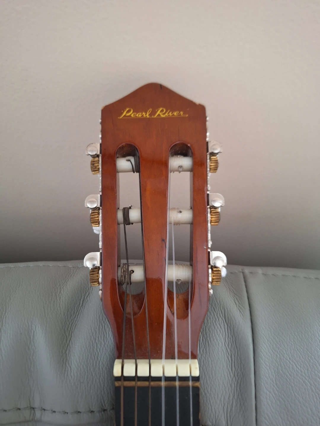 This is a Pearl River acoustic guitar with nylon strings and a wooden body. It is a 6 string guitar, comes with a full padded case and is pre-tuned.