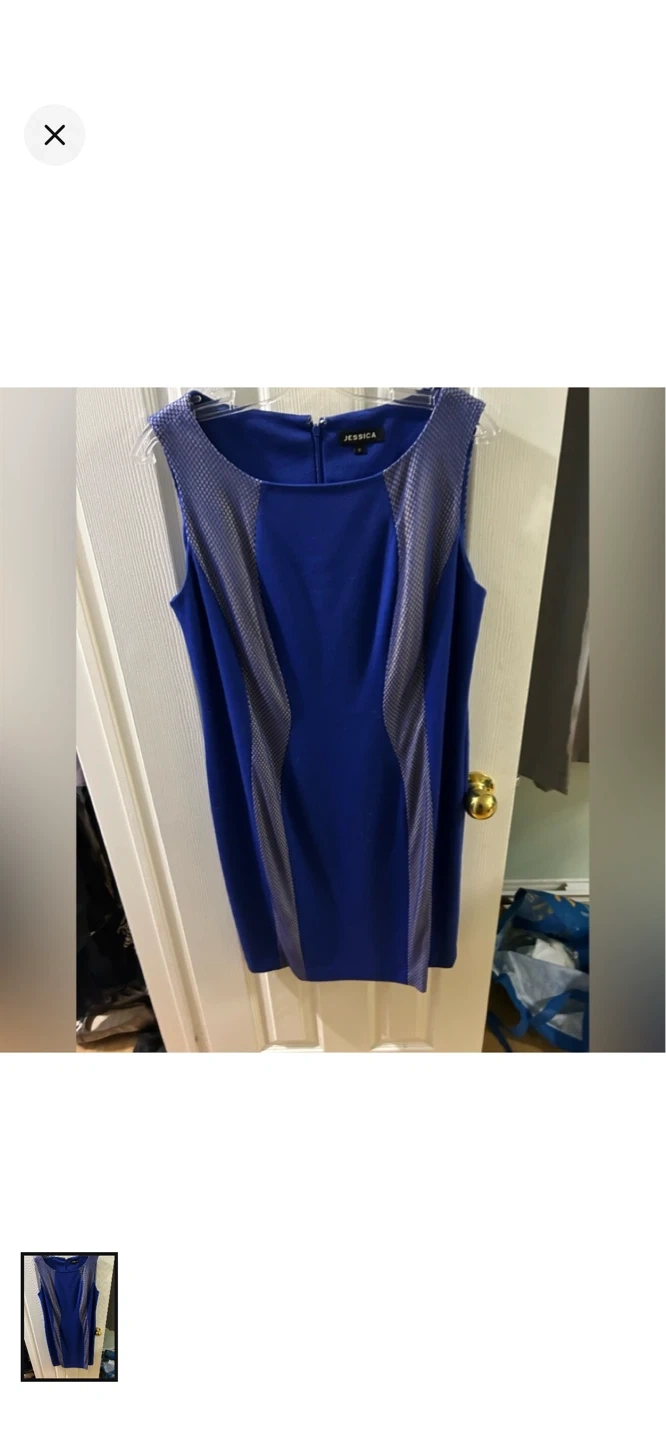 This is a Jessica brand women's blue sheath dress. It's a sleeveless design with textured grey paneling on the sides and shoulders. Zipper closure at the back.
